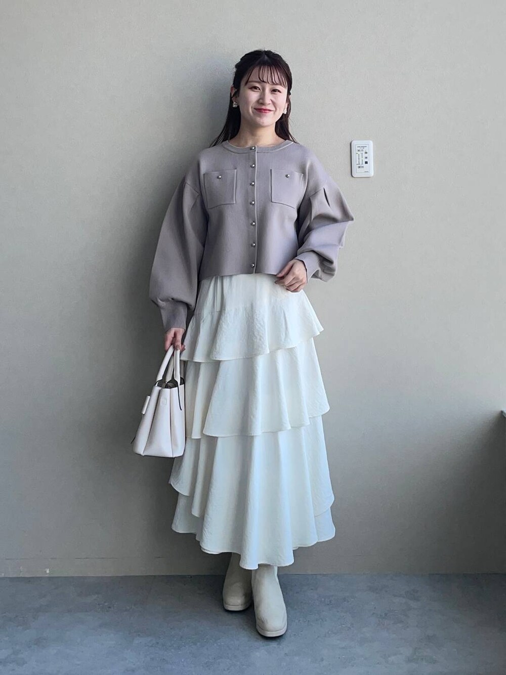 155cm|骨格ウェーブ 【カーディガン】 前を閉じるとプルオーバーでも着られるカーディガン♪ 小さめなメタルボタンがコーデを上品に見せてくれます。 ショート丈なのでコーディネートがしやすく、キャミワンピにさらっと羽織るのもこなれ感が出ます☺︎ 【スカート】 ふりふりティアードの揺れ感が可愛いスカート♪ ボリュームが出過ぎないように腰回りはすっきりデザインです☺︎ WEB限定のSサイズを着用! 【ブーツ】 しっかりヒールもありますが前底にも厚みがあるので高低差がなく疲れにくいブーツ♪ ファスナーがなく、履き口がニットなので足首が痛くなりにくいです◎ ※サンプルのためシューズはLサイズを着用していますが、普段は23.5cmでMサイズを履いています