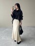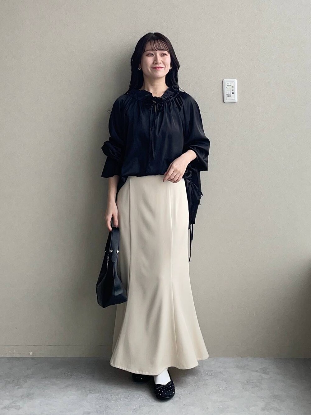 155cm|骨格ウェーブ 【ブラウス】 あんずさん企画のブラウス♡ 高見えするサテン生地で、袖口と裾に入ったドロストデザインがお洒落すぎる✨ 首元のギャザーを調整することでスタンドネックやスキッパー襟のような着こなしにもアレンジできます♪ 【スカート】 シンプルで着痩せして見えるマーメイドスカート! 縦に入ったラインが細見え効果抜群です◎ オールシーズン使えるので色違いで欲しくなるアイテムです☺︎ 155cmくるぶしくらいです。 【シューズ】 春は定番で履きたくなるバレエシューズ。 キラキラの小さいスタッズが可愛いデザインです♪ ※サンプルのためシューズはLサイズを着用していますが、普段は23.5cmでMサイズを履いています