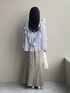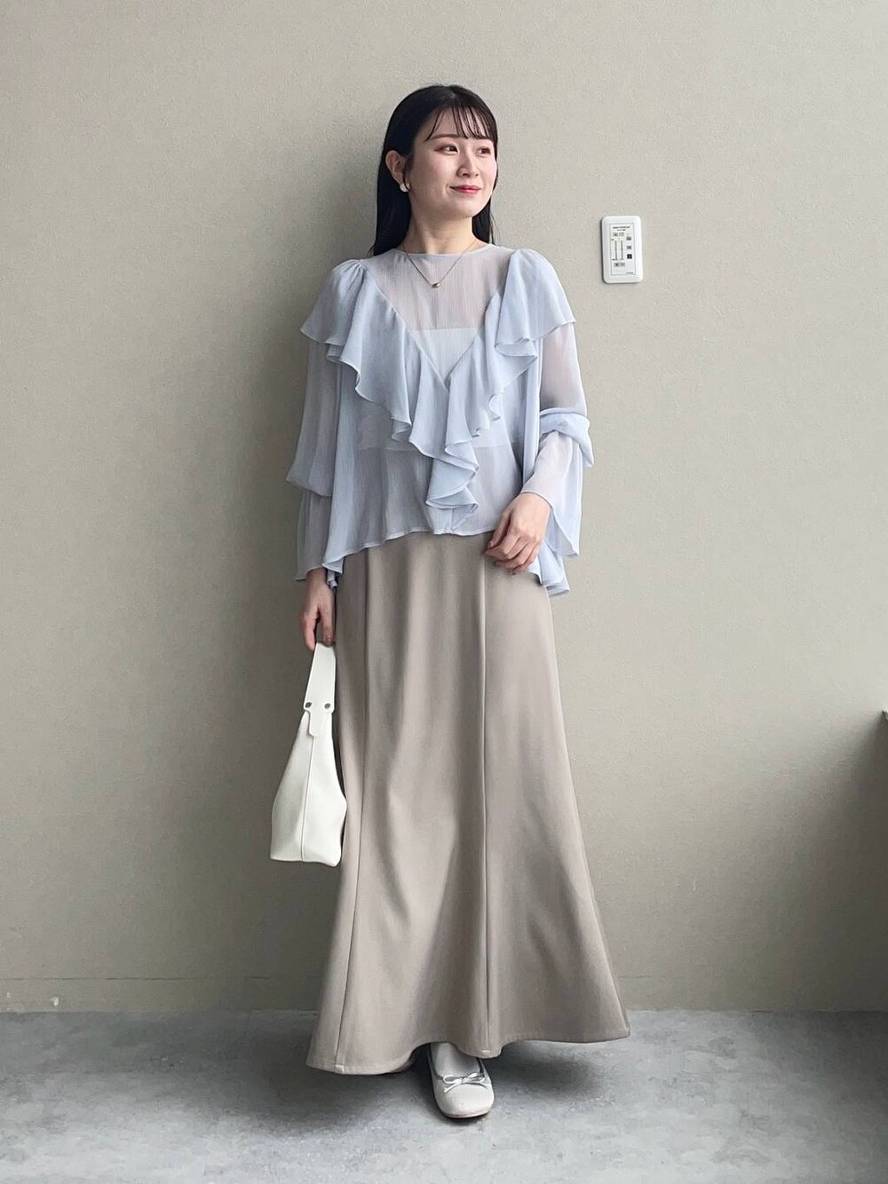 155cm|骨格ウェーブ 【ブラウス】 MiO企画ブラウス❤︎ たっぷりフリルが360度どこから見ても可愛く見えます☺️ 上品さが出る楊柳生地は、柔らかい素材で着やすいです☺︎ 前後差をつけているのでインでもアウトでもOK!スカートにもパンツにも合わせられます。 【スカート】 シンプルで着痩せして見えるマーメイドスカート! 縦に入ったラインが細見え効果抜群です◎ オールシーズン使えるので色違いで欲しくなるアイテムです☺︎ 155cmくるぶしくらいです。 【シューズ】 春は定番で履きたくなるバレエシューズ。 キラキラの小さいスタッズが可愛いデザインです♪ ※サンプルのためシューズはLサイズを着用していますが、普段は23.5cmでMサイズを履いています