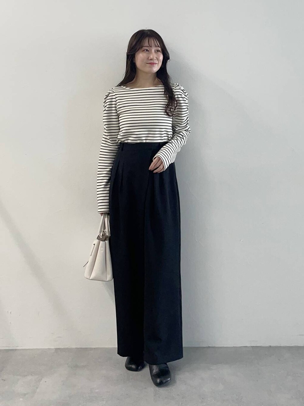 155cm|骨格ウェーブ 【トップス】 web限定のシンプルトップス♡ シンプルながらもパワショルデザインが1枚でもお洒落に着られます♪ 身頃はスッキリしているのでキャミワンピやジャンスカのインナーにもぴったりです◎ 【パンツ】 セットアップでも履けるワイドパンツ☺︎ ウエスト部分がラップ風デザインになっています♪ インして着るトップスと合わせてもすっきり着られます。 【パンプス】 太ヒールで安定感抜群のパンプス☺︎少し丸いラウンドスクエアが可愛らしい印象に♡ ※サンプルのためシューズはLサイズを着用していますが、普段は23.5cmでMサイズを履いています