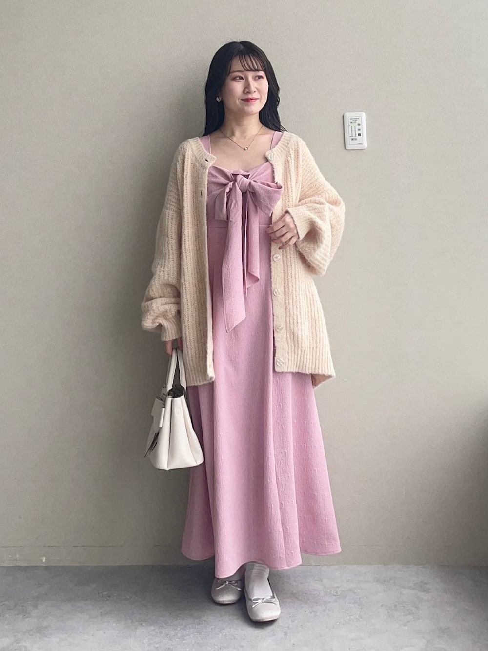 155cm|骨格ウェーブ 【カーディガン】 MiO企画のニットカーディガン♪ 前後2way、羽織りでの着方ができます♡ 全体的にオーバーサイズめに作っているのでゆる〜っと着ていただきたいです☺︎ ウエスト周りやヒップ周りの体型カバーにも◎ ワンピースに羽織ったり、ボタンを閉じてプルオーバーとしても着られるので様々なスタイリングが楽しめます! 【ワンピース】 リボンが目を惹くジャンスカ♪ ポコポコとした素材が着るだけで可愛い☺︎ インナー次第で長く着用していただけます。 【シューズ】 春は定番で履きたくなるバレエシューズ。 キラキラの小さいスタッズが可愛いデザインです♪ ※サンプルのためシューズはLサイズを着用していますが、普段は23.5cmでMサイズを履いています