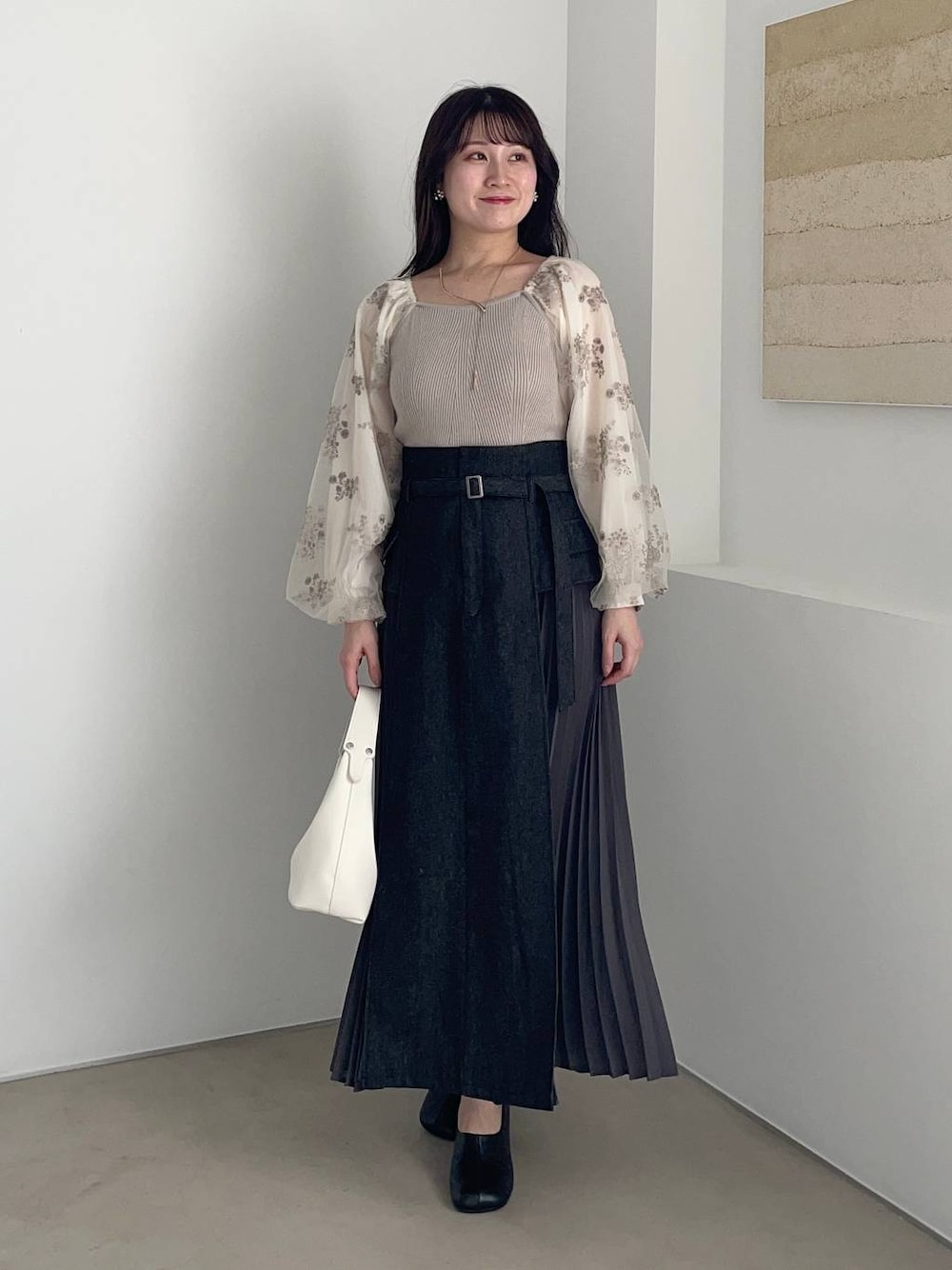 155cm|骨格ウェーブ 【トップス】 大人気刺繍ブラウスの、袖だけ刺繍バージョン!❤︎ スクエアネックでデコルテが綺麗に見えて、オフショルでも着れます♪ 身頃はすっきりしていてインスタイルにはバッチリ! 【スカート】 ミスティでお馴染みの異素材スカート! サイドだけプリーツデザインになっており、揺れ感がきれい◎ トップスはインして合わせるのがおすすめです♪ 【パンプス】 太ヒールで安定感抜群のパンプス☺︎少し丸いラウンドスクエアが可愛らしい印象に♡ ※サンプルのためシューズはLサイズを着用していますが、普段は23.5cmでMサイズを履いています
