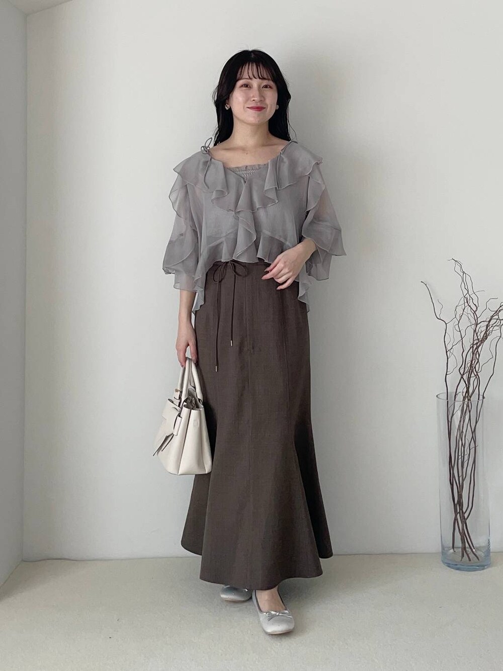 155cm|骨格ウェーブ 【ブラウス】 フリルのシアーカーディガンとキャミがセットのアイテム☺︎ 全体的にボリュームがある割に首元はすっきり◎ 【スカート】 ジャケットとセットアップでも着用できるマーメイドスカート。 ウエストにはポイントになる細リボンが付いています◎ 【シューズ】 春は定番で履きたくなるバレエシューズ。 キラキラの小さいスタッズが可愛いデザインです♪ ※サンプルのためシューズはLサイズを着用していますが、普段は23.5cmでMサイズを履いています