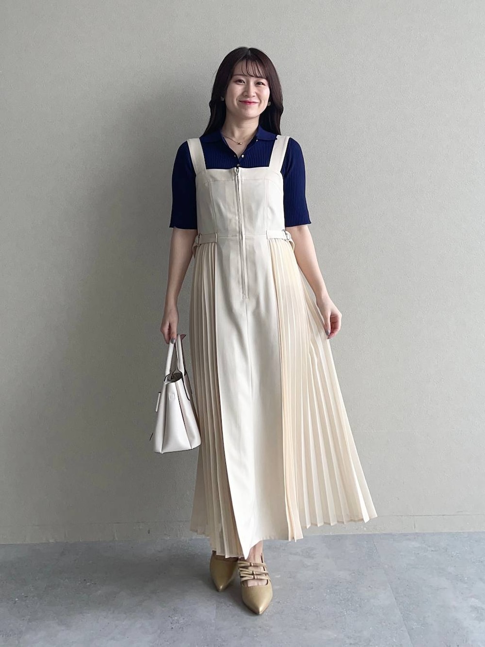 155cm|骨格ウェーブ 【トップス】 フィット感のあるリブニットですが、伸縮性があり着心地がとても良い…🥹✨ ボタンは2.3個開けるとスッキリ見えておすすめです。 【ジャンスカ】 プリーツがフェミニンなジャンスカ❤︎ サイドベルトや肩紐のボタンでウエスト、丈感を調整できます☺︎ フロントジップで着脱が楽ちんなのも嬉しい! 【パンプス】 3連リボンがポイントのきれいめパンプス。かかと部分がゴム仕様なので脱ぎ履きしやすかったです♪ ※サンプルのためシューズはLサイズを着用していますが、普段は23.5cmでMサイズを履いています