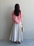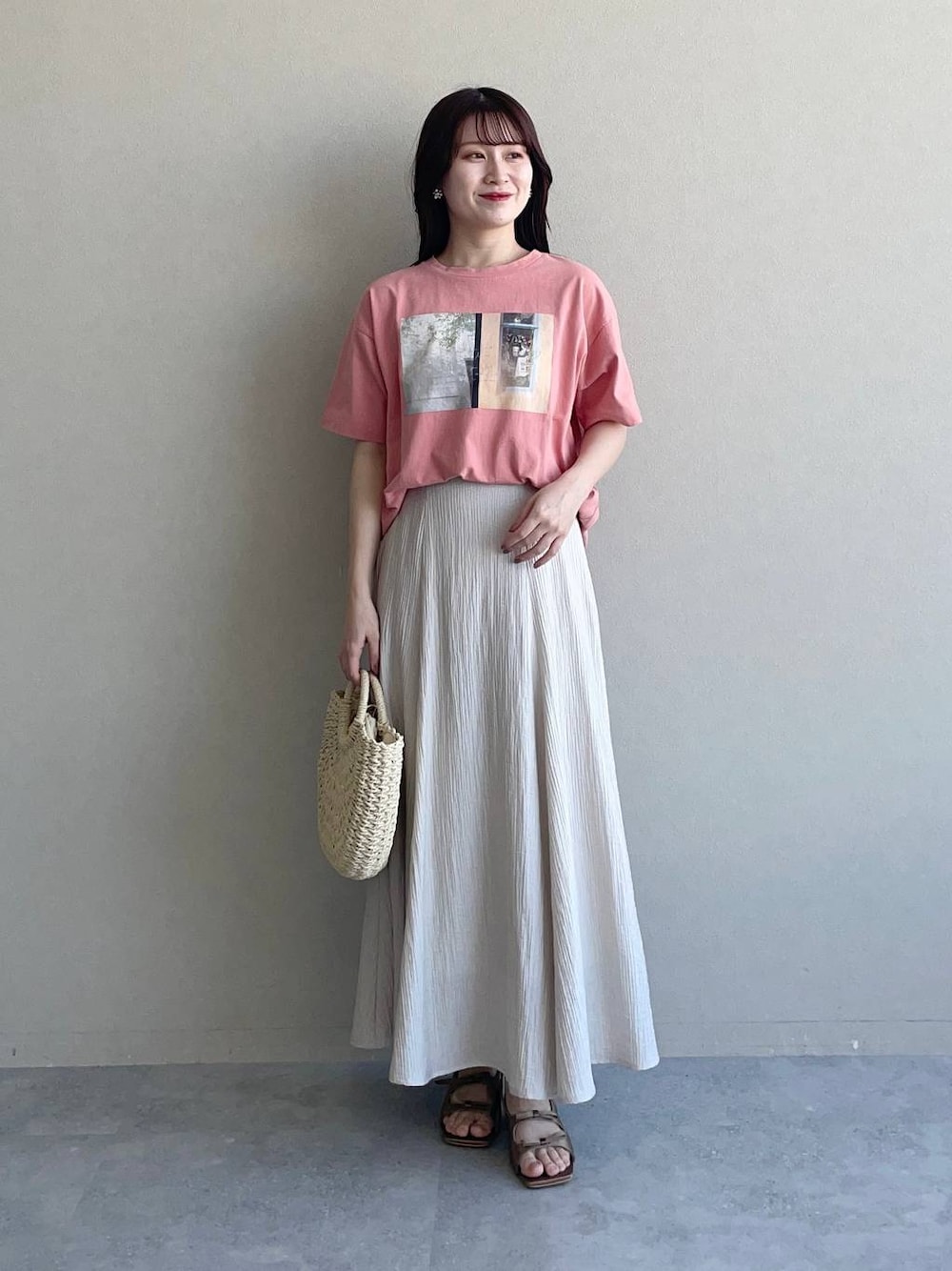 155cm|骨格ウェーブ 【Tシャツ】 花盛友里さんとのコラボアイテム♪ ゆとりのあるサイズ感で夏に大活躍なシンプルデザインのTシャツです。 花盛さん撮影のプリントに、オリジナルのメッセージを載せたデザイン。フロントプリント、バックプリント、刺繍デザインとアソート展開です☺︎ 是非お気に入りの1枚を見つけてください。 【スカート】 セットアップでも履けるフレアスカート。 さりげなくラメが入っていて少し光沢感があります♪ 155cmでくるぶしくらいの長さです! 【シューズ】 サテン素材の綺麗めミュール。さりげないダブルリボンも可愛さを出してくれます♪ ※サンプルのためシューズはLサイズを着用していますが、普段は23.5cmでMサイズを履いています