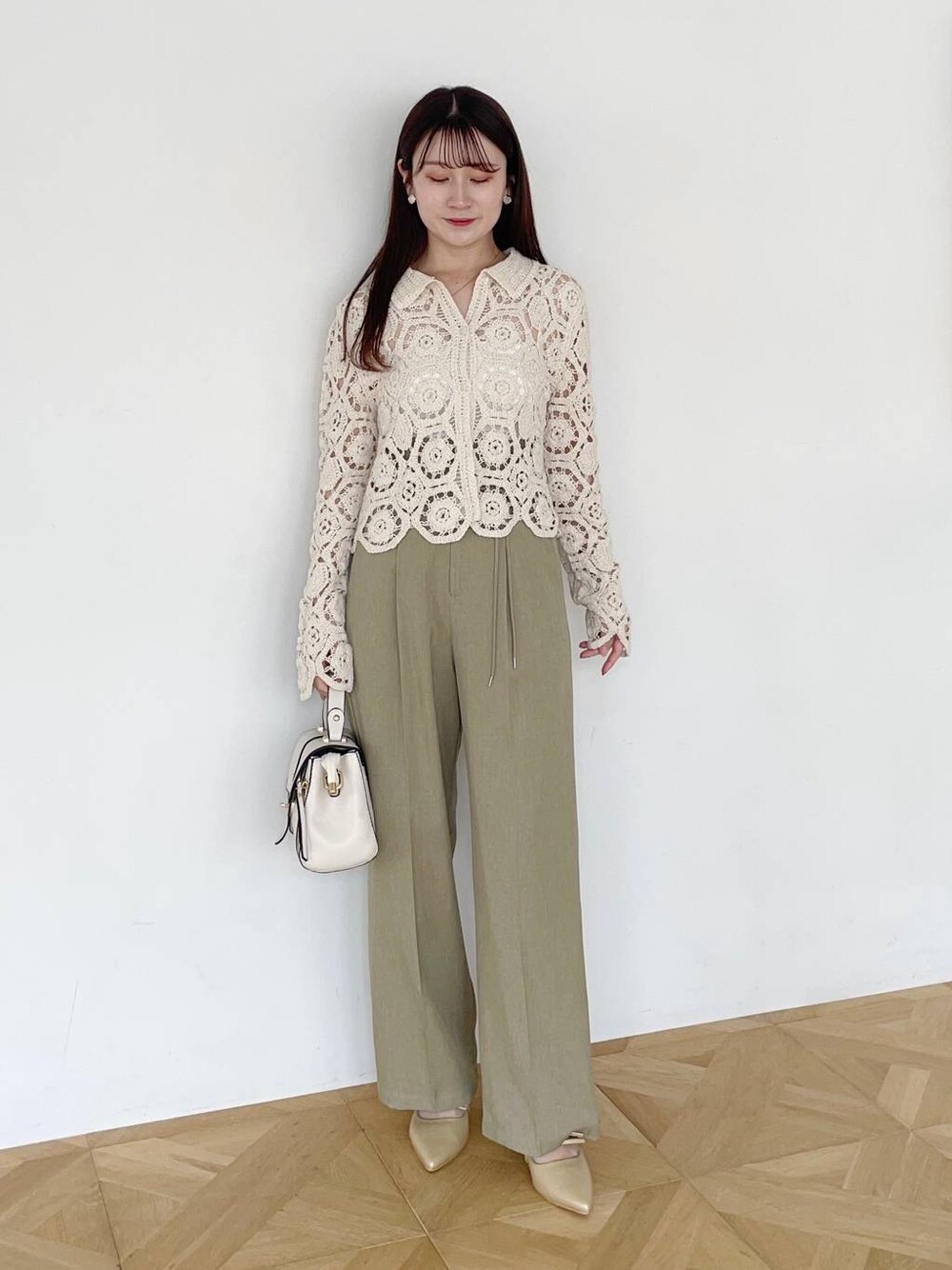 155cm|骨格ウェーブ 【トップス】 一気にオシャレ度が高くなるクロシェトップス♪ セットアップでの着用も可能です! 前はボタンなので全部つけてプルオーバーでも、開けて羽織りでも着られます。 【パンツ】 ジャケットとセットアップ着用可能なストレートパンツ! ワイド寄りのゆったりめシルエットです。 センタープレス入りで綺麗めにもコーディネートしやすいため、通勤コーデにもおすすめです。 【パンプス】 3連リボンがポイントのきれいめパンプス。かかと部分がゴム仕様なので脱ぎ履きしやすかったです♪ ※サンプルのためシューズはLサイズを着用していますが、普段は23.5cmでMサイズを履いています
