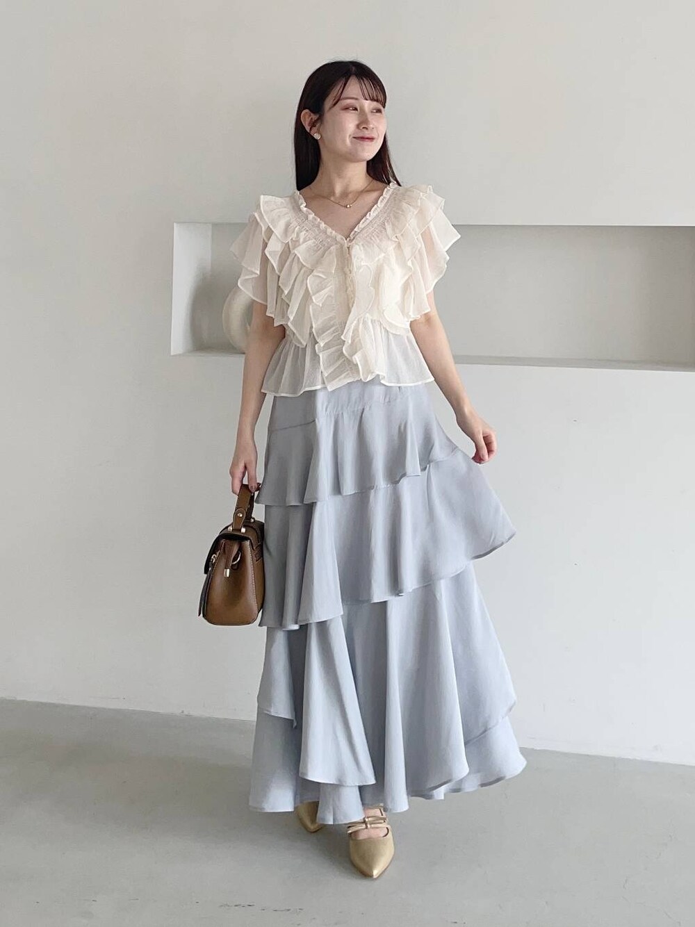 155cm|骨格ウェーブ 【トップス】 たくさんのフリルが施されたブラウス♡ フリルが気になる二の腕をカバーしてくれ、コーデが華やかになりつつも着痩せ効果あり◎ 【スカート】 なんと!大人気のアシメティアードスカートから夏素材バージョン登場♪ さらっと軽い素材で涼しく履ける◎ ボリュームが出過ぎないように腰回りはすっきりデザインです☺︎ 【パンプス】 3連リボンがポイントのきれいめパンプス。かかと部分がゴム仕様なので脱ぎ履きしやすかったです♪ ※サンプルのためシューズはLサイズを着用していますが、普段は23.5cmでMサイズを履いています