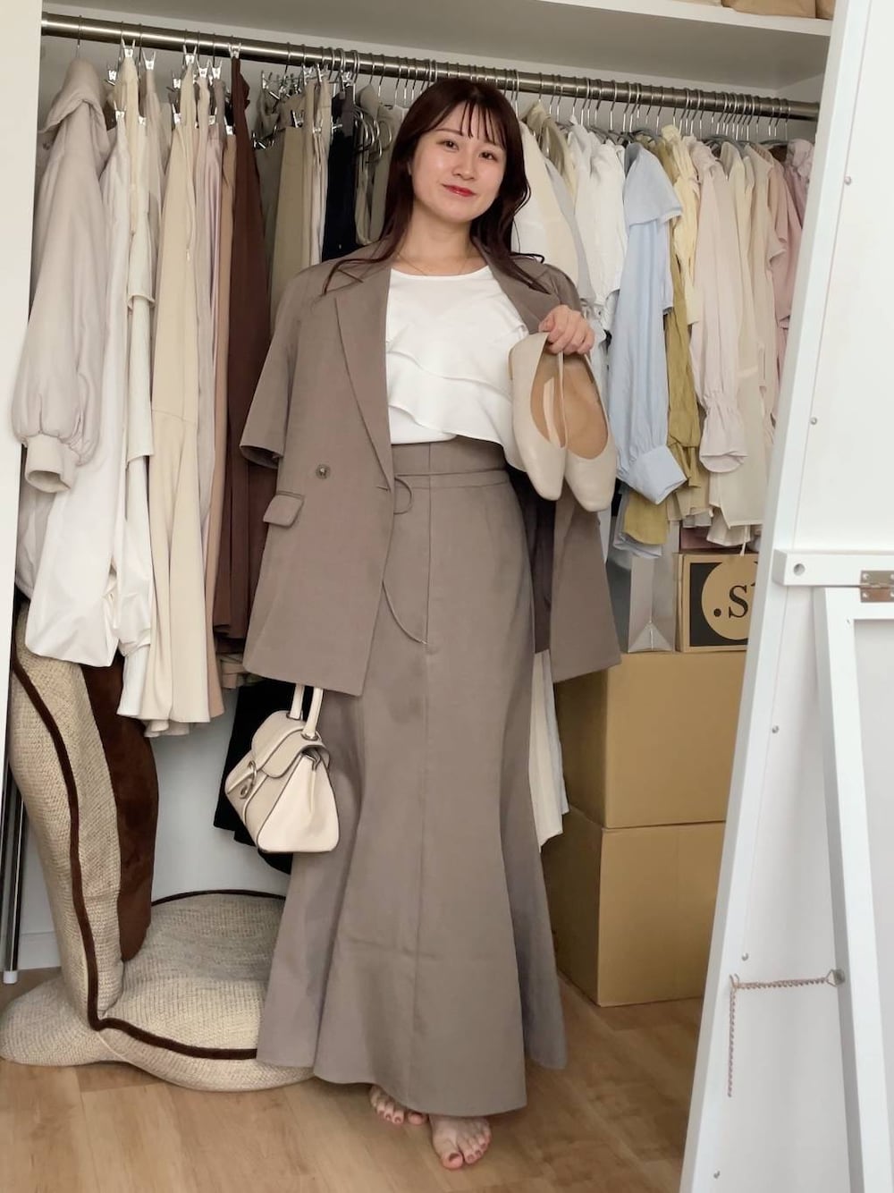 155cm|骨格ウェーブ 【ジャケット】 かちっとしすぎない、程よいオーバーサイズのジャケット! ミドル丈なのでヒップ周りを隠してくれます♪ 【ブラウス】 web限定のフリルたっぷりブラウス♡ 存在感があり着るだけでお洒落なコーデに!! たくさんのフリルが二の腕をカバーしてくれます🤭 スカートにもパンツにも合わせやすいブラウスです♪ 【スカート】 ジャケットとセットアップでも着用できるマーメイドスカート。 ウエストにはポイントになる細リボンが付いています◎