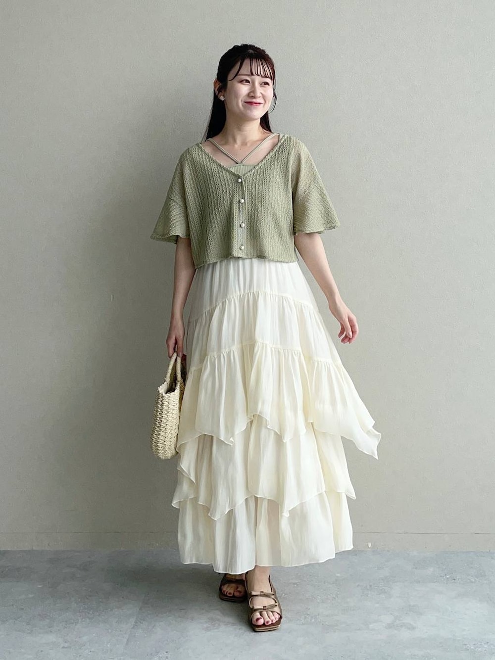 155cm|骨格ウェーブ 【トップス】 タンクトップがセットで別々でも着用可◎ フレアスリーブ、パールボタンデザインがフェミニンな印象にしてくれます♪ 【スカート】 ボリュームたっぷりなランダムヘムにボリュームたっぷりなデザインスカート♪ 左裾にはスリットが入っていて抜け感が出ます☺︎ 【シューズ】 サテン素材の綺麗めミュール。さりげないダブルリボンも可愛さを出してくれます♪ ※サンプルのためシューズはLサイズを着用していますが、普段は23.5cmでMサイズを履いています