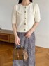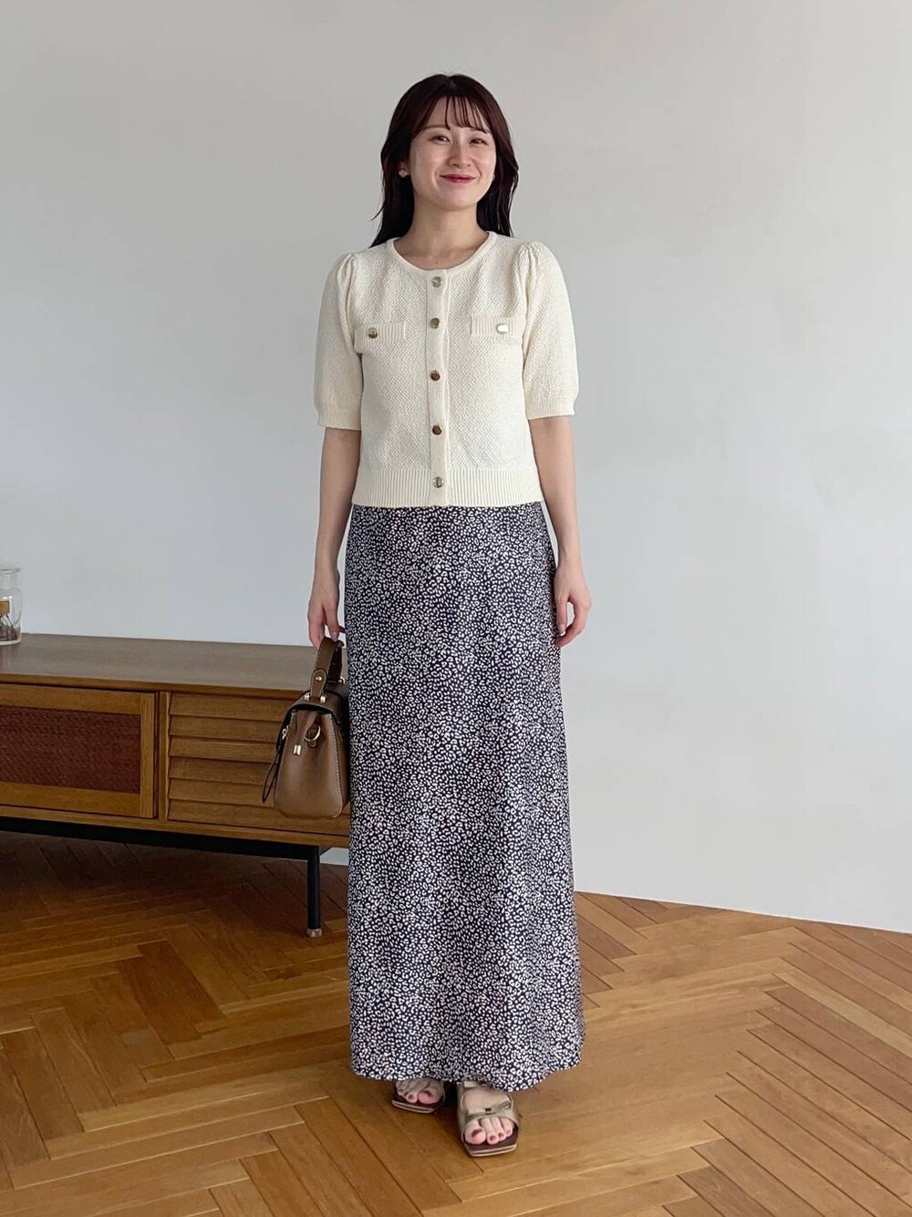 155cm|骨格ウェーブ 【カーディガン】 ON/OFFで着られるサマーカーディガン♡チクチク感はゼロです。 ほんのりボリューム袖が二の腕をカバーしてくれます♪ コーディネートがしやすいコンパクトな着丈◎ 【スカート】 程よくフィット感があり、コーディネートを上品な印象に見せてくれます。 伸縮性があるので履き心地がとてもよいです。 【シューズ】 サテン素材の綺麗めミュール。さりげないダブルリボンも可愛さを出してくれます♪ ※サンプルのためシューズはLサイズを着用していますが、普段は23.5cmでMサイズを履いています
