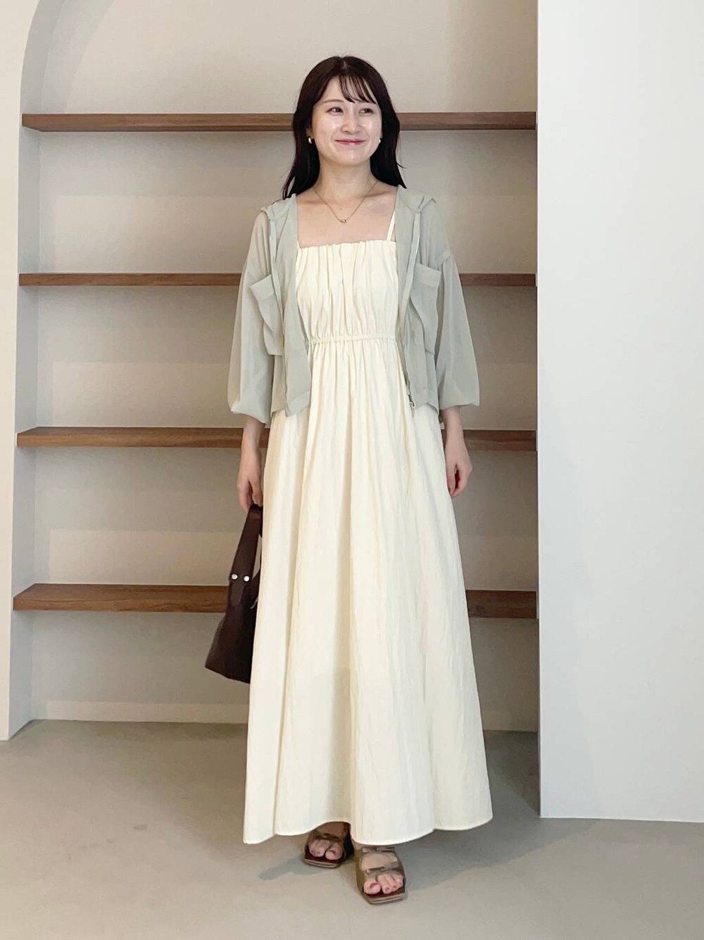 155cm|骨格ウェーブ 【パーカー】 毎年大人気のシアーパーカーが今年も❤︎ カジュアルになりがちなパーカーも、楊柳素材で フェミニンコーデにも合わせやすい! 上品な透け感なのでタンクトップにさらっと羽織るのも◎ 【ワンピース】 袖の位置を変えたり、袖を取ってキャミワンピースのみでも着用できるワンピース。 キャミワンピースバージョンでの着こなしです。 シャカシャカとした素材で、スポサンと合わせてカジュアルスタイルも楽しめます。 胸元には柔らかいゴムが入っており、かがんでも安心なデザイン! アジャスターがついていますが、1番上に調整しても、155cmで足首くらいでした。少し長めです。 【サンダル】 フロント部分のギャザーが可愛いデザイン!スポサンでもカジュアルになりすぎない細めラインと厚底具合♪ ※サンプルのためシューズはLサイズを着用していますが、普段は23.5cmでMサイズを履いています