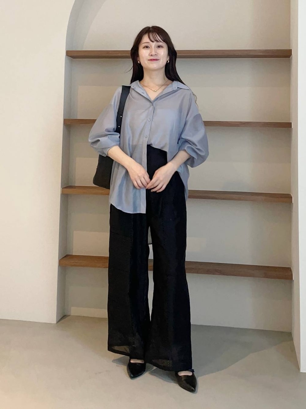 155cm|骨格ウェーブ 【シャツ】 程よい透け感が夏の羽織りで着やすいシャツ♪ もちろんプルオーバーでも着用できます。 バックリボンが付いているのでポイントになる&お好みのシルエットに調整できます◎ 【パンツ】 パッチワークレースを使ったイージーパンツ。 リラックス感がありつつ、少し太めなストレートシルエットですが綺麗めなファッションにも合わせやすいです♪ 【パンプス】 3連リボンがポイントのきれいめパンプス。かかと部分がゴム仕様なので脱ぎ履きしやすかったです♪ ※サンプルのためシューズはLサイズを着用していますが、普段は23.5cmでMサイズを履いています