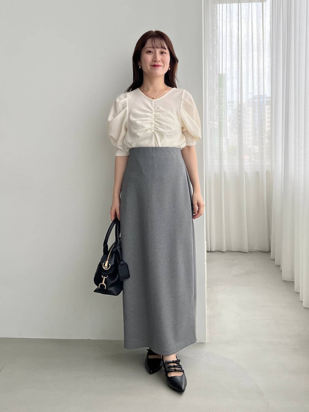 155cm|骨格ウェーブ 【トップス】 フロントのギャザーが目を引くデザイントップス。 胸元のギャザー、少しボリュームのある袖、深すぎないVネックが骨格ウェーブ大優勝なトップス🎶 シンプルなボトムスに合わせるだけでも華やかになります☺︎ 【スカート】 骨格ウェーブの私には、ものによっては骨盤が目立ちやすいナロースカートですが このスカートは程よくゆとりがあり骨盤が目立たない!むしろ細見えしまくりました!!! 全体的に伸縮性があるので履き心地も良いし、インスタイルでもミドル丈を合わせたスタイリングもできるのがフェミニン女子にとっては嬉しいポイントです♪ 【パンプス】 3連リボンがポイントのきれいめパンプス。かかと部分がゴム仕様なので脱ぎ履きしやすかったです♪ ※サンプルのためシューズはLサイズを着用していますが、普段は23.5cmでMサイズを履いています