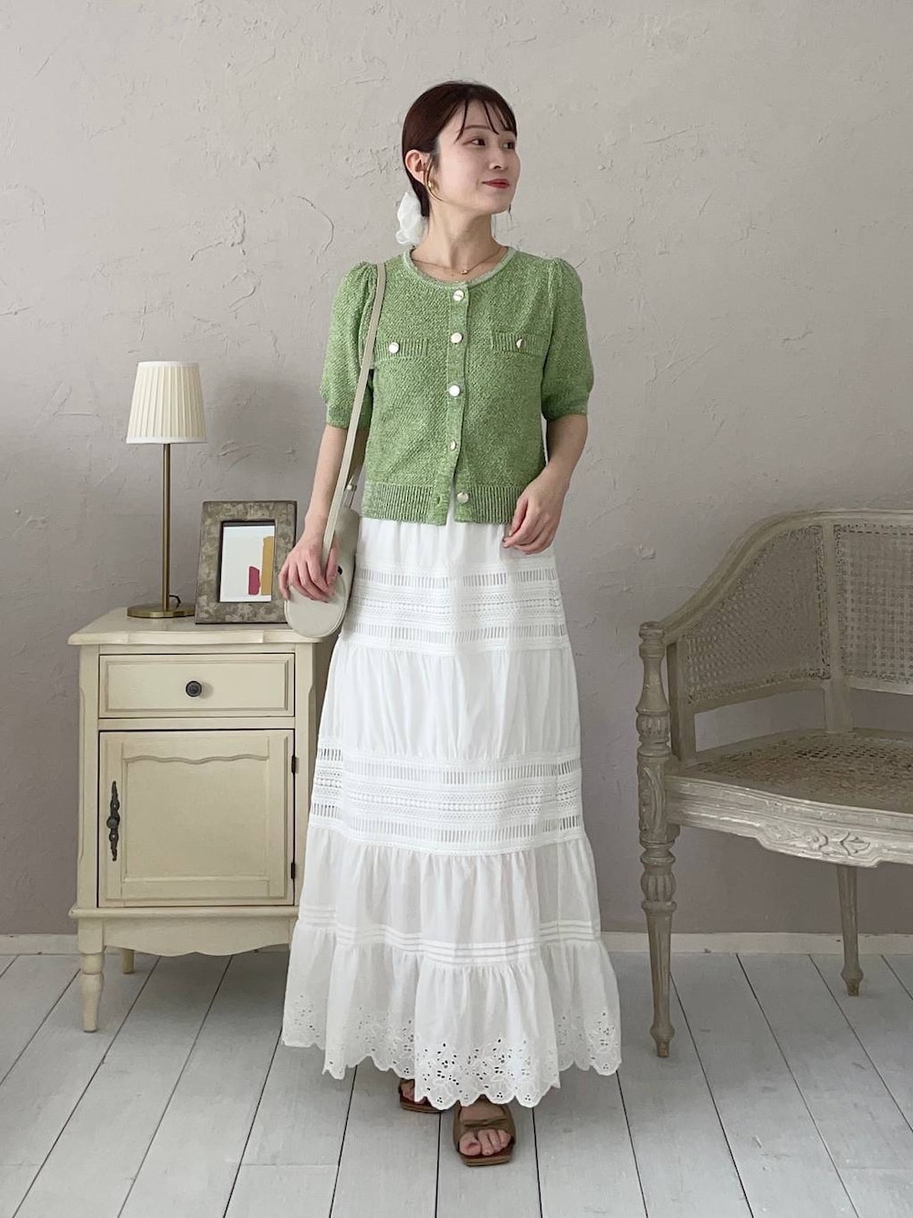 155cm|骨格ウェーブ 【カーディガン】 ON/OFFで着られるサマーカーディガン♡チクチク感はゼロです。 ほんのりボリューム袖が二の腕をカバーしてくれます♪ コーディネートがしやすいコンパクトな着丈◎ 【スカート】 穿くだけで爽やかな印象になるコットンスカート。 ファスナーがなくオールゴムなので穿き心地最高!! ショート丈やコンパクトなトップスと合わせるのがおすすめです。 【サンダル】 フロント部分のギャザーが可愛いデザイン!スポサンでもカジュアルになりすぎない細めラインと厚底具合♪ ※サンプルのためシューズはLサイズを着用していますが、普段は23.5cmでMサイズを履いています