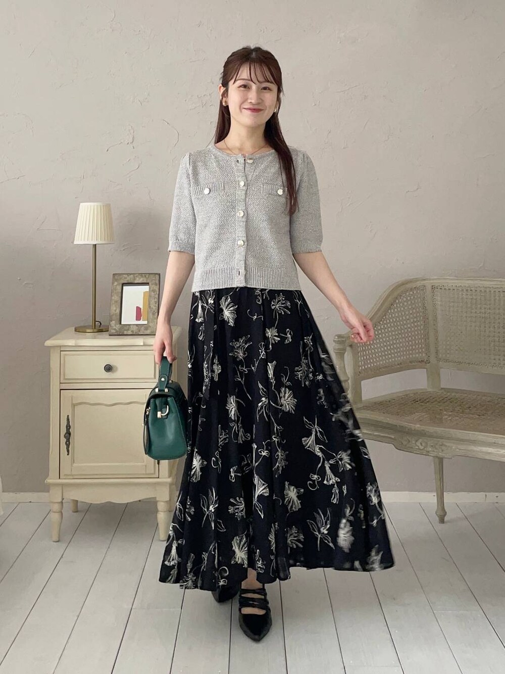 155cm|骨格ウェーブ 【カーディガン】 ON/OFFで着られるサマーカーディガン♡チクチク感はゼロです。 ほんのりボリューム袖が二の腕をカバーしてくれます♪ コーディネートがしやすいコンパクトな着丈◎ 【スカート】 フェミニンコーデにはマストなふんわり広がるフレアスカート! 大花柄、ジャガードどちらも上品な印象に見せてくれます。 コンパクトなトップスと合わせたコーデがおすすめです◎