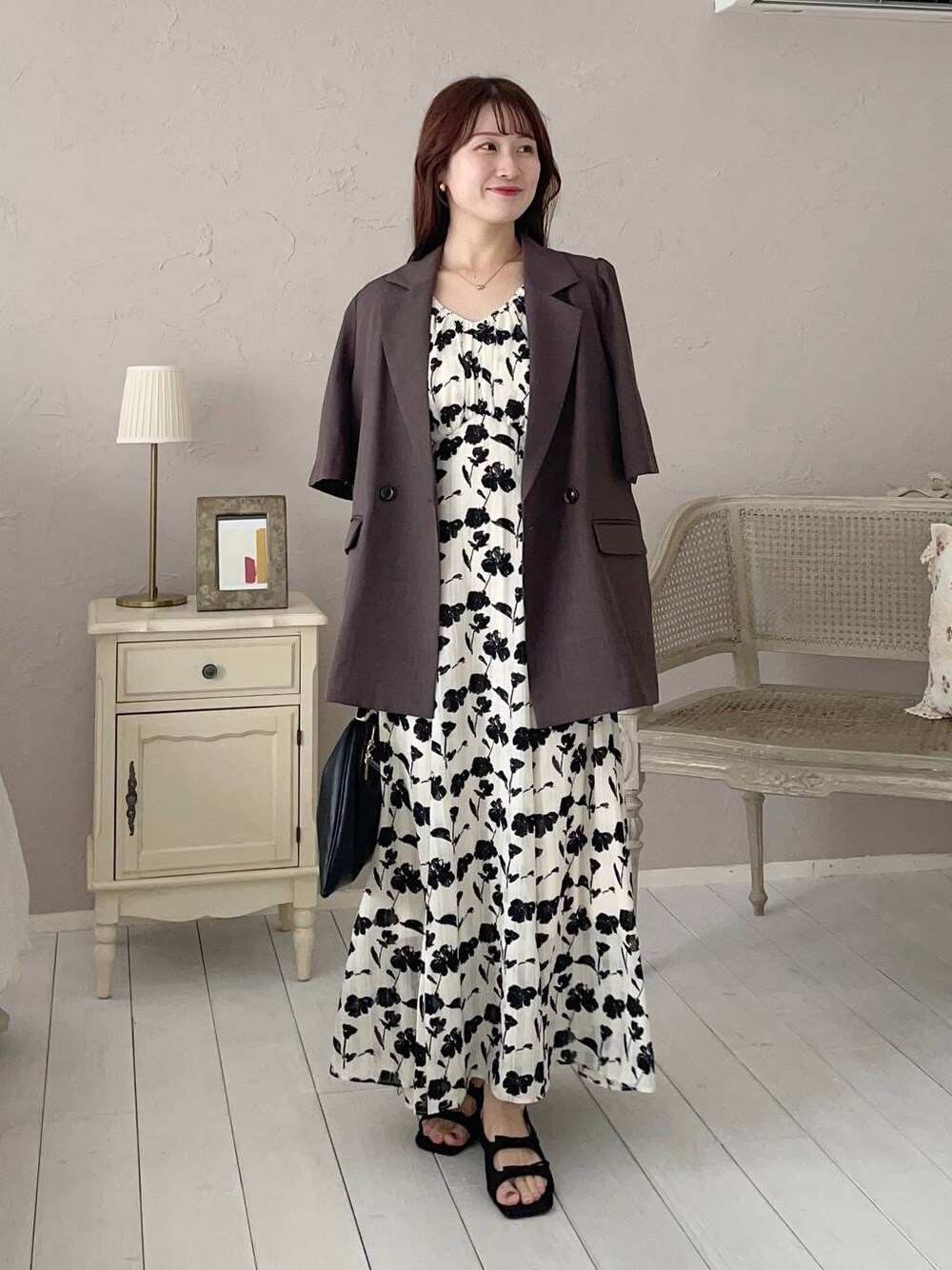155cm|骨格ウェーブ 【ジャケット】 かちっとしすぎない、程よいオーバーサイズのジャケット! ミドル丈なのでヒップ周りを隠してくれます♪ 【ワンピース】 大花柄が目を引くエンパイアシルエットのワンピース♪ 胸下の切り替え位置が高く骨盤が目立たないので、スタイルが詐欺れます◎ 襟ぐりがゴムなのでオフショルでも着られます。 【サンダル】 フロント部分のギャザーが可愛いデザイン!スポサンでもカジュアルになりすぎない細めラインと厚底具合♪ ※サンプルのためシューズはLサイズを着用していますが、普段は23.5cmでMサイズを履いています