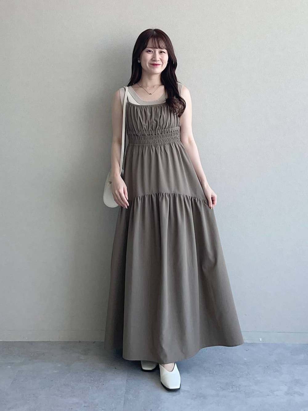 155cm|骨格ウェーブ 【タンクトップ】 配色デザインが可愛く、1枚でもインナーとしても使いやすいタンクトップ。 ショルダー部分が太めなので安心して着られます☺︎ 【ワンピース】 ファスナーなし!裏地なし!楽ちんで涼しく着られる激推しキャミワンピース♡ 胸下のギャザーはめちゃめちゃ伸びるので苦しくないです♪ アジャスター付きなので丈は調整できます◎ 【ミュール】 Vカット&スクエアトゥがシンプルでコーディネートに取り入れやすいミュール。 程よいヒールで歩きやすいです。 ※サンプルのためシューズはLサイズを着用していますが、普段は23.5cmでMサイズを履いています