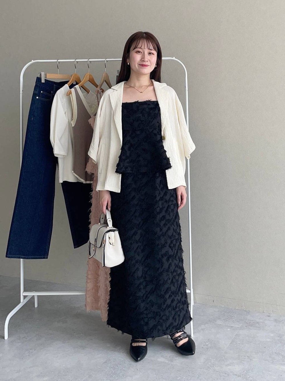 155cm|骨格ウェーブ 【ジャケット】 ゆるっとオーバーサイズの楊柳ジャケット! 夏でもサラッと羽織れて便利な1着です☺︎ ボタンを閉じてトップスとして着用するのもおすすめです♪ 【キャミワンピース】 フラッフィー素材が可愛いキャミワンピース♪ 1枚で着映えします☺︎ ペプラムデザインなのでお腹周りをカバーできるのもポイントです! アジャスターで調整でき、155cmの私はフラットシューズでも着られました。 【パンプス】 3連リボンがポイントのきれいめパンプス。かかと部分がゴム仕様なので脱ぎ履きしやすかったです♪ ※サンプルのためシューズはLサイズを着用していますが、普段は23.5cmでMサイズを履いています