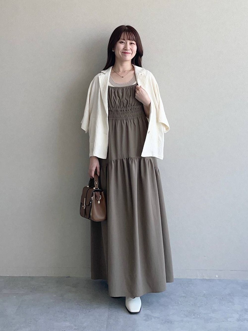 155cm|骨格ウェーブ キャミワンピースにジャケットを羽織った、気温調整のしやすいコーデ♪ 二の腕を出したくない方はサラッと羽織れるジャケットがあるととても便利です☺︎ 【ジャケット】 ゆるっとオーバーサイズの楊柳ジャケット! 夏でもサラッと羽織れて便利な1着です☺︎ ボタンを閉じてトップスとして着用するのもおすすめです♪ 【タンクトップ】 配色デザインが可愛く、1枚でもインナーとしても使いやすいタンクトップ。 ショルダー部分が太めなので安心して着られます☺︎ 【ワンピース】 ファスナーなし!裏地なし!楽ちんで涼しく着られる激推しキャミワンピース♡ 胸下のギャザーはめちゃめちゃ伸びるので苦しくないです♪ アジャスター付きなので丈は調整できます◎ 【ミュール】 Vカット&スクエアトゥがシンプルでコーディネートに取り入れやすいミュール。 程よいヒールで歩きやすいです。 ※サンプルのためシューズはLサイズを着用していますが、普段は23.5cmでMサイズを履いています