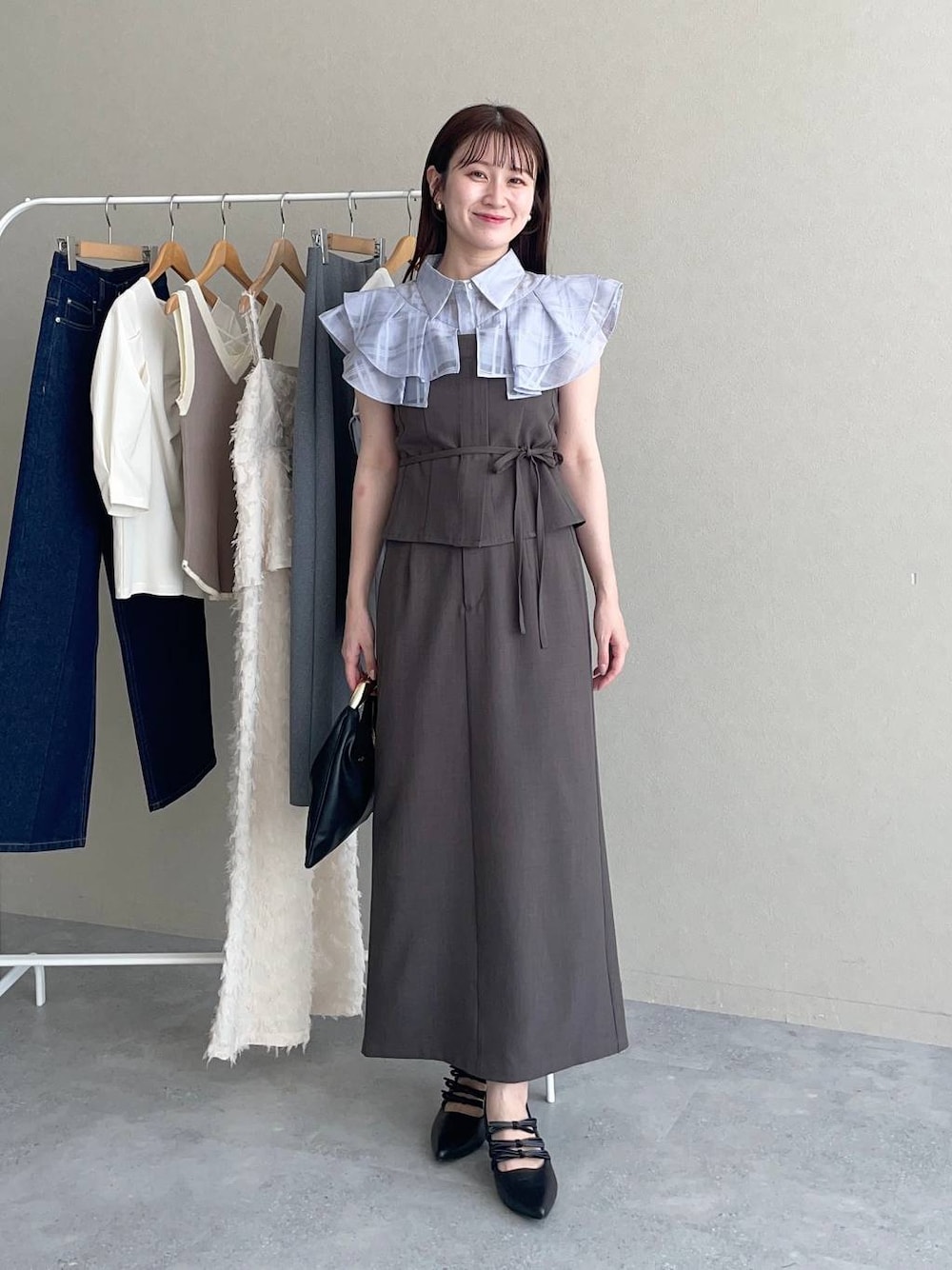 155cm|骨格ウェーブ コルセットがセットのスカートはビスチェで着用してドッキングワンピ風に! お気に入りの組み合わせです☺︎ 【ブラウス】 程よい透け感で上品に着られるチェック柄ブラウス♪ 少しハリがあり、フリルが崩れないのが嬉しいポイント。 大人かわいく着られます☺︎ 【スカート】 毎度大人気のコルセットセットスカート。 スカートはナローシルエットで単体でも使いやすく、ビスチェは胸元でつけるとドッキングワンピースっぽく着られるため着こなしを楽しめます☺︎ 【パンプス】 3連リボンがポイントのきれいめパンプス。かかと部分がゴム仕様なので脱ぎ履きしやすかったです♪ ※サンプルのためシューズはLサイズを着用していますが、普段は23.5cmでMサイズを履いています