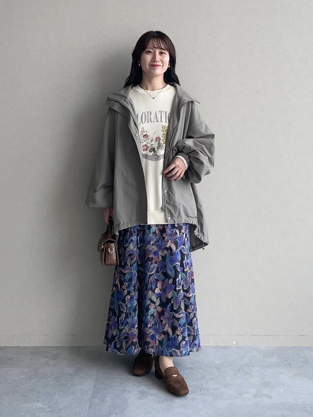 【アウター】 ゆるっとビッグシルエットが可愛いブルゾンです♡ 裾のドロストコードで好みのシルエットに調整でき、厚手のニットの上にも羽織れるので長く着られます♪ 【スウェット】 ルーズなシルエットでカジュアルに着こなせる、ヴィンテージライクなスウェット。 花柄スカートやナロースカートと合わせるのがおすすめです 【スカート】 アンティーク調の花柄が、一気にコーディネートを華やかにしてくれる1枚。 緩やかな曲線美のマーメイドスカートで腰回りが気になりにくく綺麗に穿けました♪ 【ローファー】 シンプルで流行り廃りなく履けるローファー◎フロントのコインがポイントに☺︎ ※サンプルのためシューズはLサイズを着用していますが、普段は23.5cmでMサイズを履いています 155cm|骨格ウェーブ