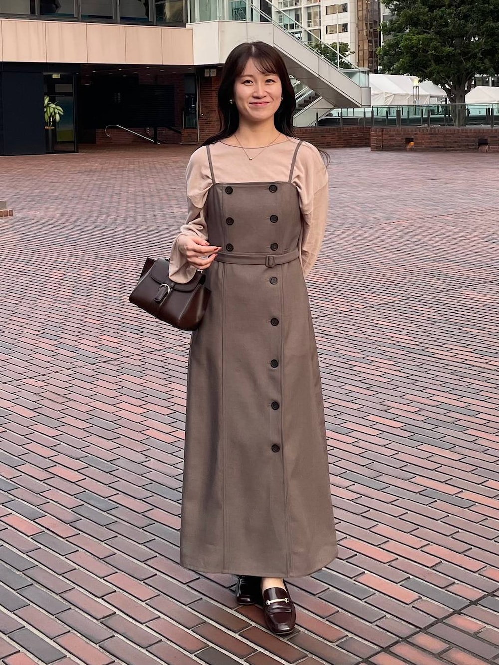 美容室に行った日のコーデ♪ 長時間座ってもシワになりにくいの最高😌 【キャミワンピース】 フロントのボタンがポイントに。 ベルトでウエストの調整ができますが、骨格ウェーブはきゅっと絞ってウエストを強調させるとバランスよく着られます◎ 155cm|骨格ウェーブ