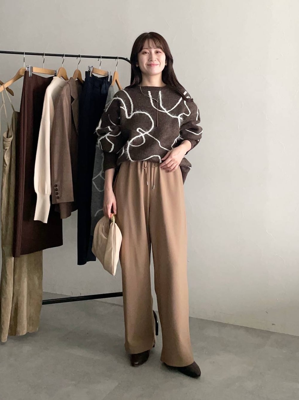 【ニット】 少しオーバーサイズですが丈はインでもアウトでも着られる丈感。155cmの私でも着られている感なく着用できました! 【パンツ】 Mサイズ着用。 履いてびっくり!動きやすさ、ウエストの楽さ、穿き心地がとにかく良いです◎ 綺麗めコーデにも馴染みやすいのが嬉しいポイント! 【ショートブーツ】 ポインテッドトゥが脚を綺麗に見せてくれるブーツ。ストレッチがきいているので靴擦れもしにくく履きやすいです。 ※サンプルのためシューズはLサイズを着用していますが、普段は23.5cmでMサイズを履いています 155cm|骨格ウェーブ