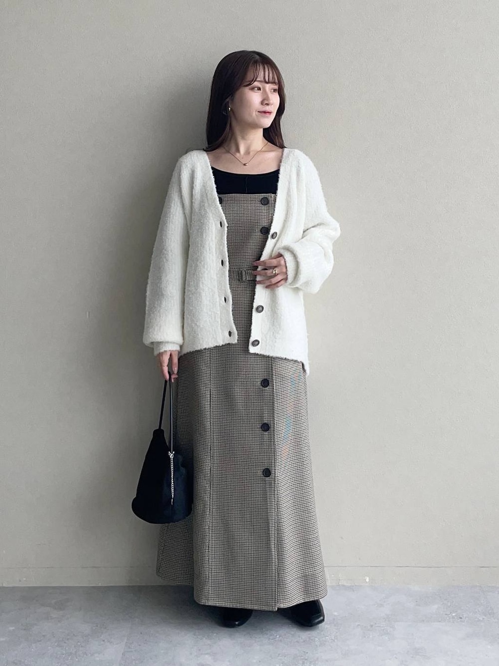 【カーディガン】 羽織りでもトップスでも着やすいvネックカーディガン! インナーを変えることによって長く着られるよ♪ 素肌に当ってもチクチクしないです◎ 【キャミワンピース】 フロントのボタンがポイントに。 ベルトでウエストの調整ができますが、骨格ウェーブはきゅっと絞ってウエストを強調させるとバランスよく着られます◎ 155cm|骨格ウェーブ