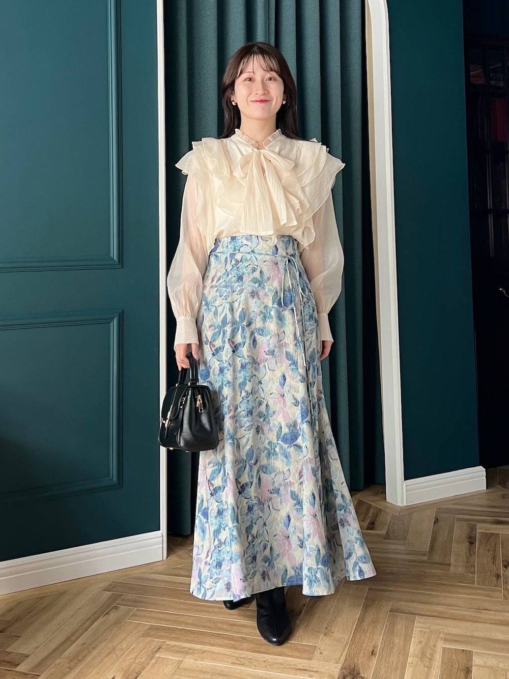 【ブラウス】 大好きなボウタイブラウス♪ 存在感はありつつもボリュームが出過ぎないリボンなので甘めが苦手な方も着やすいです。 前後2wayでリボン後ろでもOK 【スカート】 アンティーク調の花柄が、一気にコーディネートを華やかにしてくれる1枚。 緩やかな曲線美のマーメイドスカートで腰回りが気になりにくく綺麗に穿けました♪ 【ショートブーツ】 ポインテッドトゥが脚を綺麗に見せてくれるブーツ。ストレッチがきいているので靴擦れもしにくく履きやすいです。 ※サンプルのためシューズはLサイズを着用していますが、普段は23.5cmでMサイズを履いています 155cm|骨格ウェーブ
