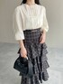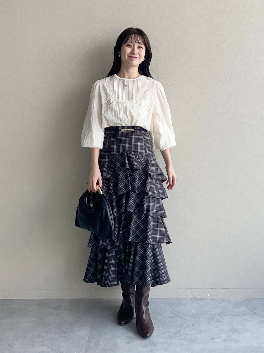 【ブラウス】 ピンタックレースがクラシカルなブラウス。 着るだけで自然なボリューム袖になるのも嬉しい♪ 【スカート】 コーデの主役になるフリルスカート! 腰回りはすっきりなので骨格ウェーブの私でも骨盤は目立たずに穿けました♪ 【ショートブーツ】 ポインテッドトゥが脚を綺麗に見せてくれるブーツ。ストレッチがきいているので靴擦れもしにくく履きやすいです。 ※サンプルのためシューズはLサイズを着用していますが、普段は23.5cmでMサイズを履いています 155cm|骨格ウェーブ