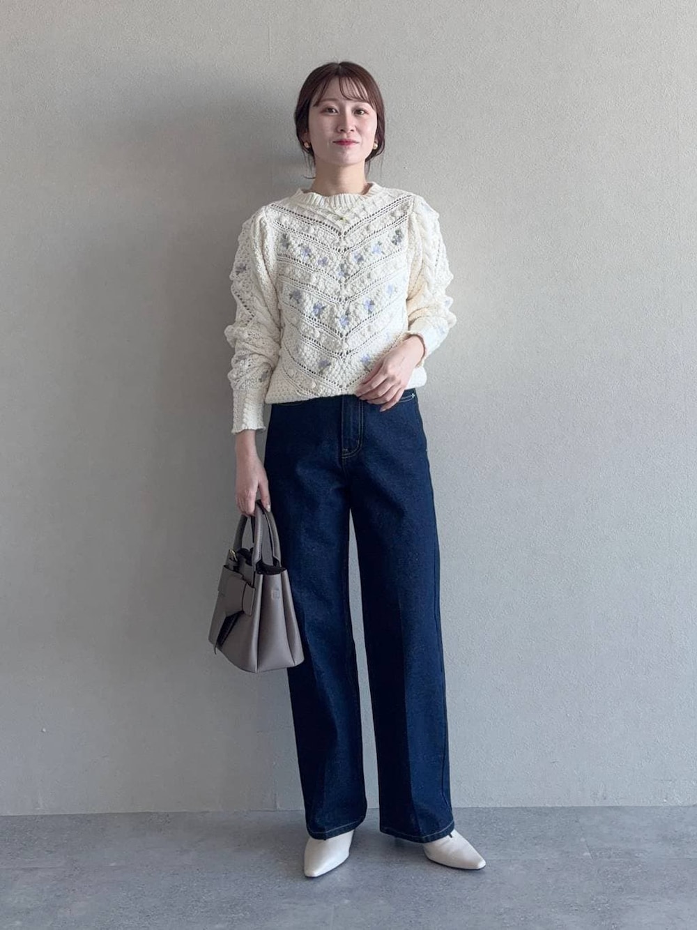 甘めニットをデニムと合わせてカジュアルダウンさせました♪ 【ニット】 花の刺繍デザイン、ぽこっとしたポップコーン風の編み地、 鹿の子編みなどデザインが盛りだくさんで1枚で着映える✨ コンパクトなサイズ感でもたつかないです◎ 【デニム】 S.Mサイズ展開のSサイズ着用。 155cmギリギリの丈!ヒールあった方が安心です。 ハイウエストで脚が長く見えました🎶 155cm|骨格ウェーブ