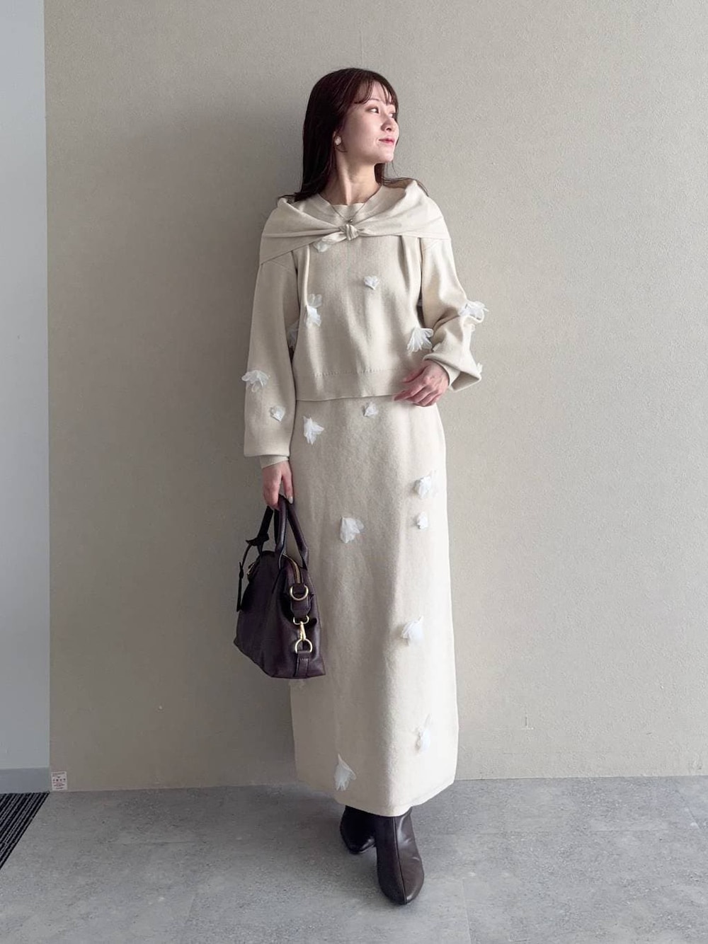 お洒落なセットアップコーデ。花びらとストールがコーデのアクセントに! 【ニット】 ストールとセットのニット! 立体的なフラワーモチーフが付いたデザイン。 セットアップで着用できるスカートもあるので一緒に着てもいいし、お花が特徴的なのでシンプルなボトムと合わせるのもおすすめ! 【スカート】 ニットとセットアップで穿けるスカート。 ニットスカートですが腰が張ることもなく、意外と身体のシルエットも出ずに穿けました! 【ショートブーツ】 ポインテッドトゥが脚を綺麗に見せてくれるブーツ。ストレッチがきいているので靴擦れもしにくく履きやすいです。 ※サンプルのためシューズはLサイズを着用していますが、普段は23.5cmでMサイズを履いています 155cm|骨格ウェーブ