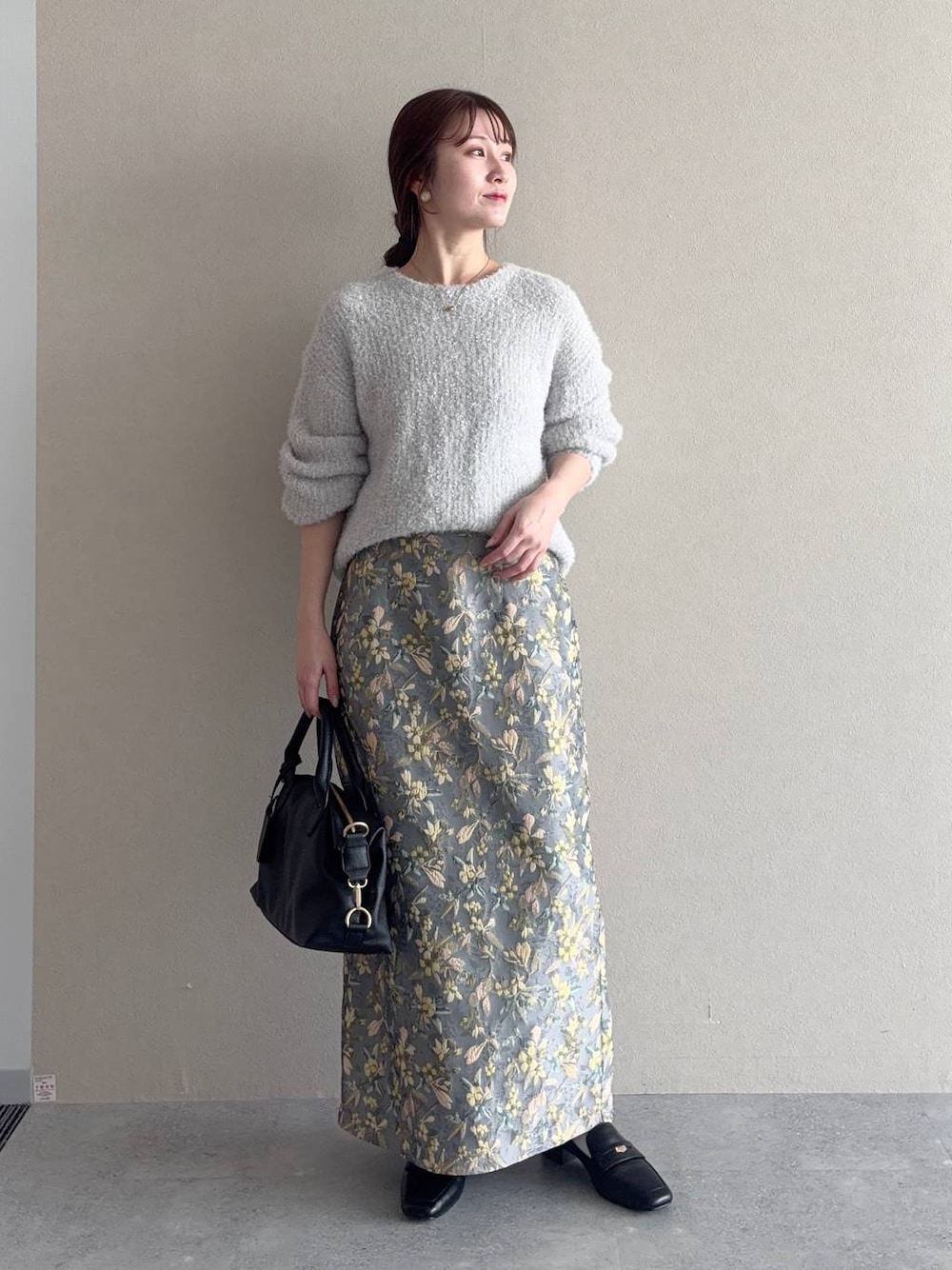 【ニット】 シンプルなのに、テープヤーンとミニシャギーニットの糸で存在感のあるアイテム。 ヒップにかかるくらいの長さでゆるっとアウトで着たり、前だけインもしやすい◎ 【スカート】 光沢感のある上品スカート。 程よくゆとりのあるサイズ感で薄手ニットをインしたり、ミドル丈のカーディガンを合わせてもすっきり! 【ローファー】 シンプルで流行り廃りなく履けるローファー◎フロントのコインがポイントに☺︎ ※サンプルのためシューズはLサイズを着用していますが、普段は23.5cmでMサイズを履いています 155cm|骨格ウェーブ