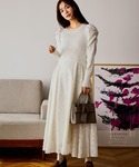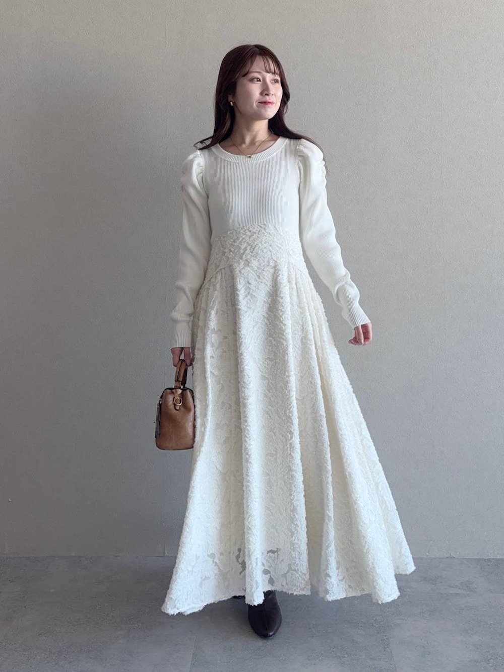 【ワンピース】 ドッキングデザインで1枚で華やかに着られるワンピース♡ ウエストの切り替え位置が高くラウンドしているためスタイルアップ効果も。 スカート部分は高級感のあるジャガード生地で、揺れが上品です◎ 【ショートブーツ】 ポインテッドトゥが脚を綺麗に見せてくれるブーツ。ストレッチがきいているので靴擦れもしにくく履きやすいです。 ※サンプルのためシューズはLサイズを着用していますが、普段は23.5cmでMサイズを履いています 155cm|骨格ウェーブ