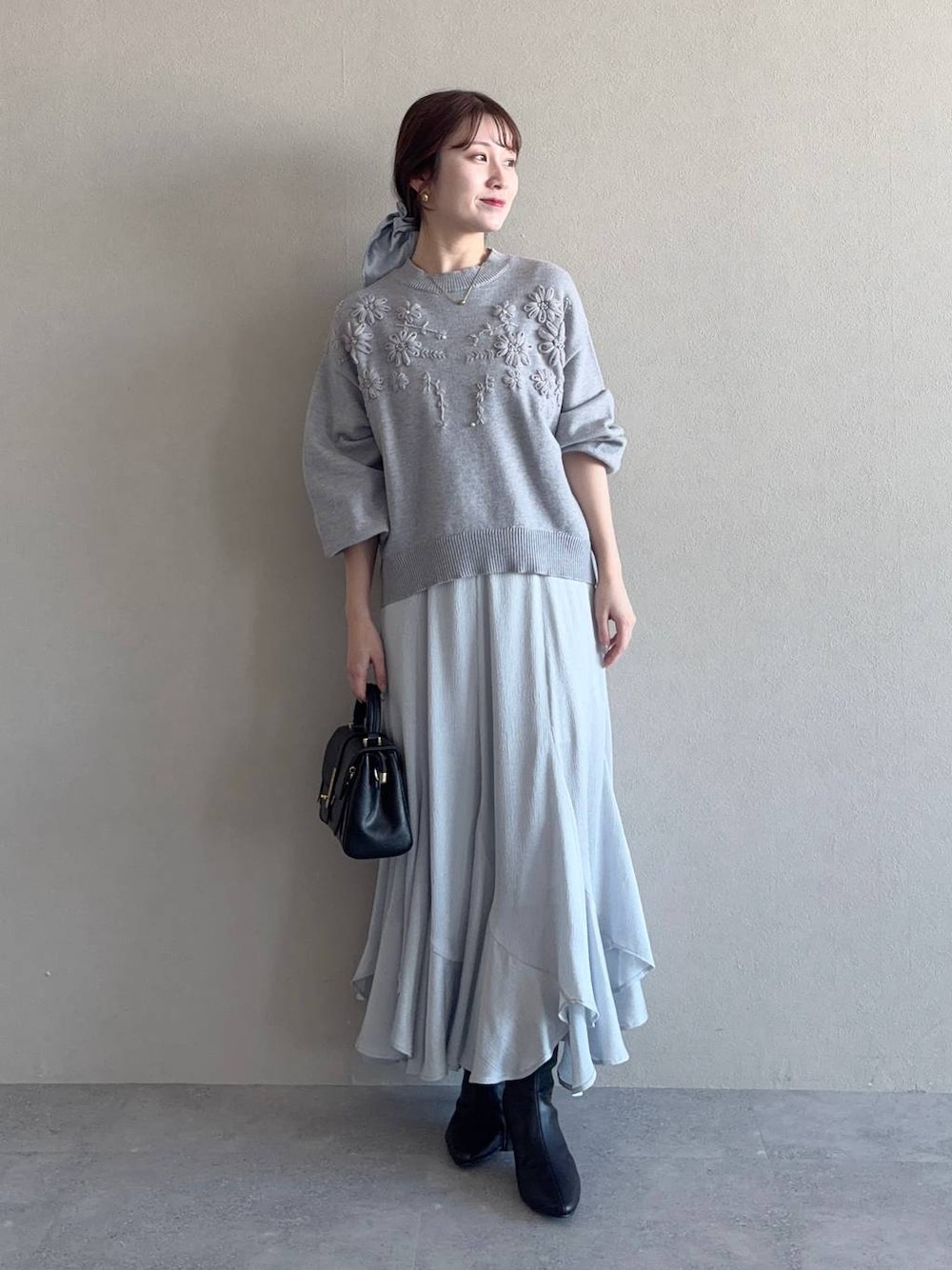 【ニット】 同系色の刺繍デザインがさりげないポイントに。 さらに小さなパールやビーズも施された上品なニット。 甘めなスカートと合わせたり、春らしくデニムと合わせたカジュアルコーデもおすすめです! 【スカート】 大人気のマーメイドスカートから、微光沢で表面感のある生地バージョンが登場! 骨格ウェーブの私でも腰回りは張らずに綺麗に穿けます。 【ショートブーツ】 ポインテッドトゥが脚を綺麗に見せてくれるブーツ。ストレッチがきいているので靴擦れもしにくく履きやすいです。 ※サンプルのためシューズはLサイズを着用していますが、普段は23.5cmでMサイズを履いています 155cm|骨格ウェーブ