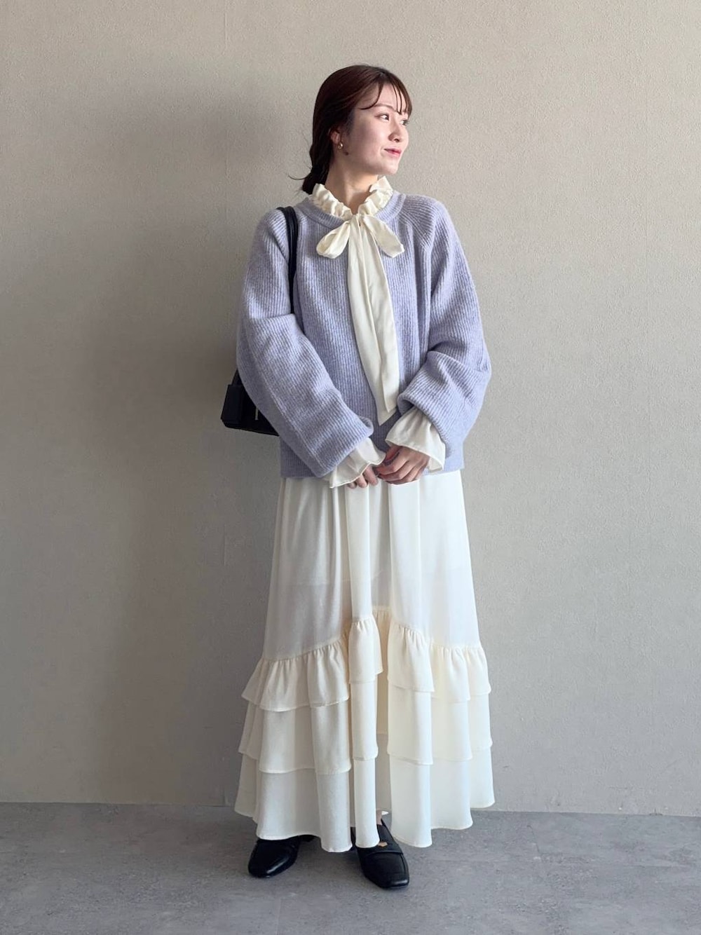 白ワンピースにパステルカラーのニットをレイヤードした春コーデ☺︎ 【ニット】 ニットのカラーをアイスクリームのフレーバーに例えた名前も可愛すぎるニット!! 柔らかい生地感でチクチクゼロです! 形はシンプルで、首元は開きすぎず詰まりすぎずなクルーネック。 お袖は少し長めでボリュームが出せます❤︎ 【ワンピース】 ネック、ウエスト、裾にフリルが沢山施されたワンピース! ネックはボウタイの締め具合でハイネックや、緩めるとvネック風にアレンジができます。 【ローファー】 シンプルで流行り廃りなく履けるローファー◎フロントのコインがポイントに☺︎ ※サンプルのためシューズはLサイズを着用していますが、普段は23.5cmでMサイズを履いています 155cm|骨格ウェーブ