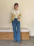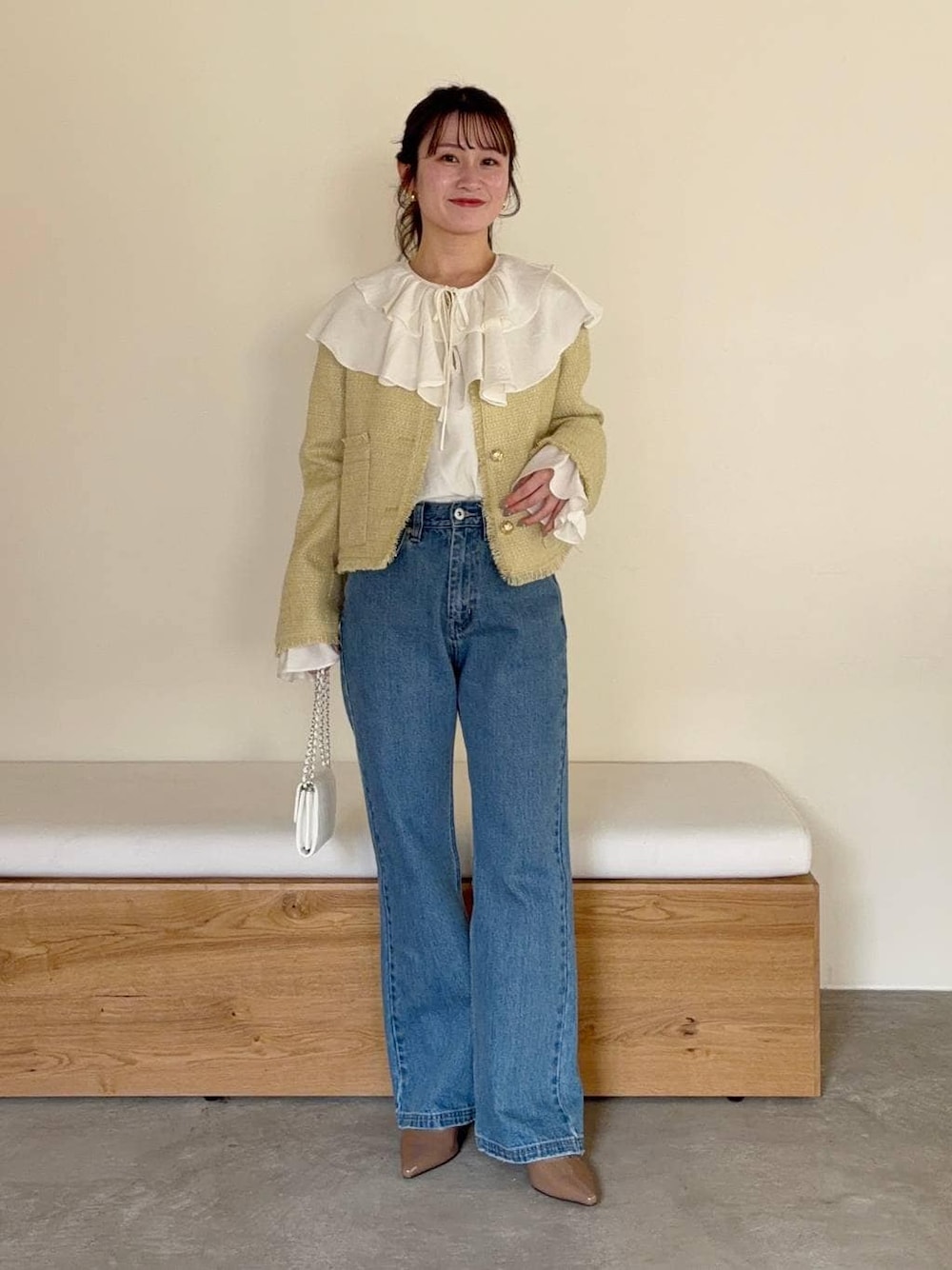 【ジャケット】 すっきり丈のツイードジャケット。 デニムと合わせてカジュアルなコーデや、きれいめパンツと合わせるとオフィスコーデも楽しめます☺︎ 生地が柔らかくて羽織っていて窮屈感がないのも嬉しい! 【ブラウス】 2段フリルが施された甘めブラウス! 1枚ではもちろん、カーディガンやニットを重ねるのも◎ 【デニム】 Mサイズ着用。少し長かったのでヒールを穿いた方が綺麗なシルエットで穿けます。 色落ちがきれいで長く穿ける国産デニムです。 155cm|骨格ウェーブ