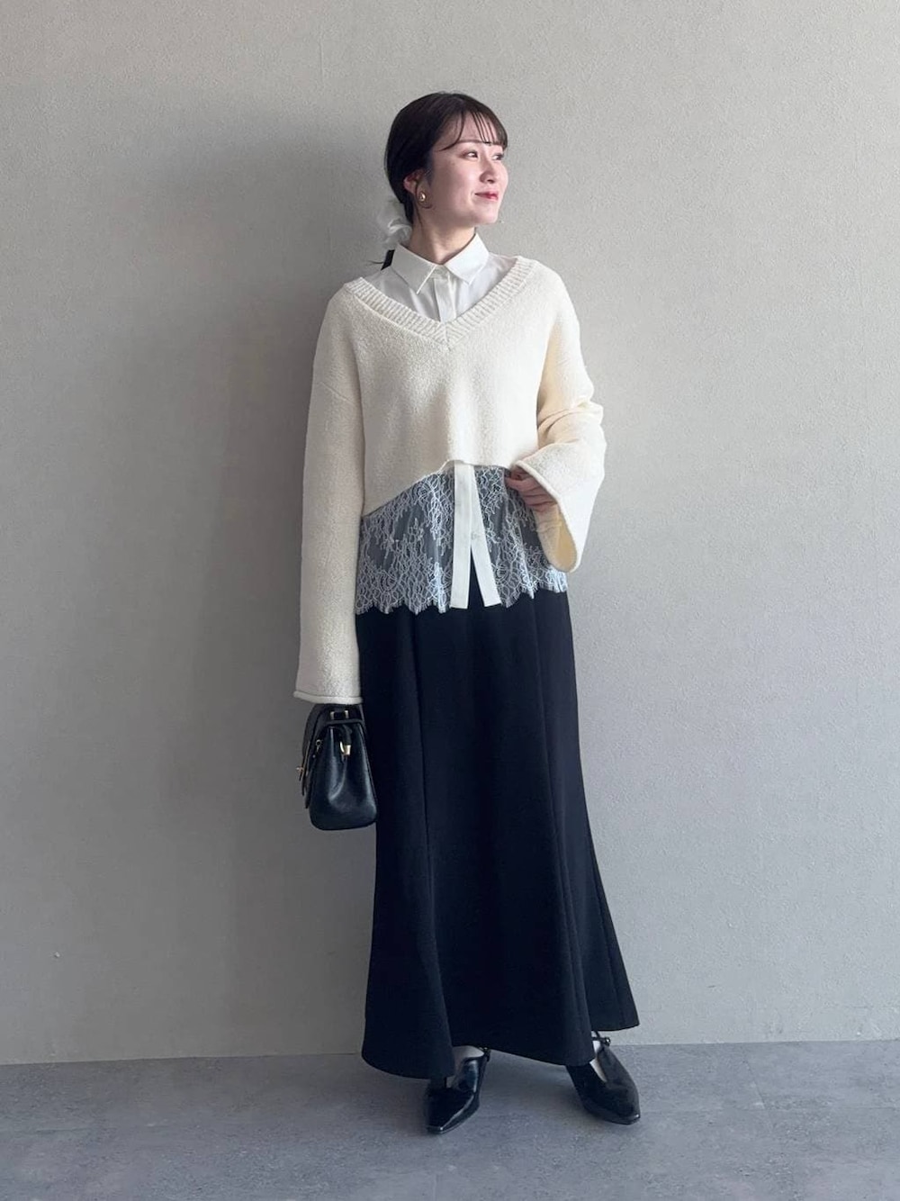 【シャツ】 裾がレースになっているシャツ♡ 1枚でもレイヤードスタイルでも楽しめる✨ レーヨン混で少しとろみがありカジュアルになりすぎないのもお気に入りポイント!! 【ニット】 レイヤードにぴったりなVネックのニット。 低身長にはもたつかず着られる丈☺︎ 【スカート】 定番のシンプルなマーメイドスカート。 腰まわりはタイトすぎず骨格ウェーブの私でも穿きやす買ったです☺︎ 155cm|骨格ウェーブ