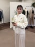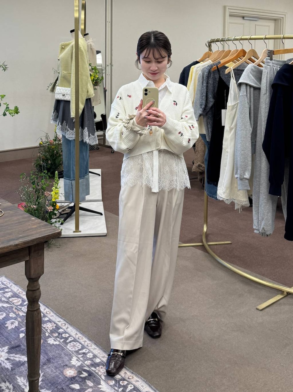 【カーディガン】 ニットタンクとセットのショートカーディガン。 カーディガンのみ着用。 甘くなりすぎないヴィンテージライクな花柄がさりげなくポイントに!Vネックがゆるい抜け感をつくることができバランスもとりやすい◎ 【シャツ】 1枚でもレイヤードでも可愛く着こなせるシャツ。 カジュアルになりがちなシャツにレースがついていることでフェミニン好きな私にも着やすいデザイン! ショート丈のトップスを合わせてレイヤードするのがおすすめです 155cm|骨格ウェーブ