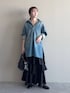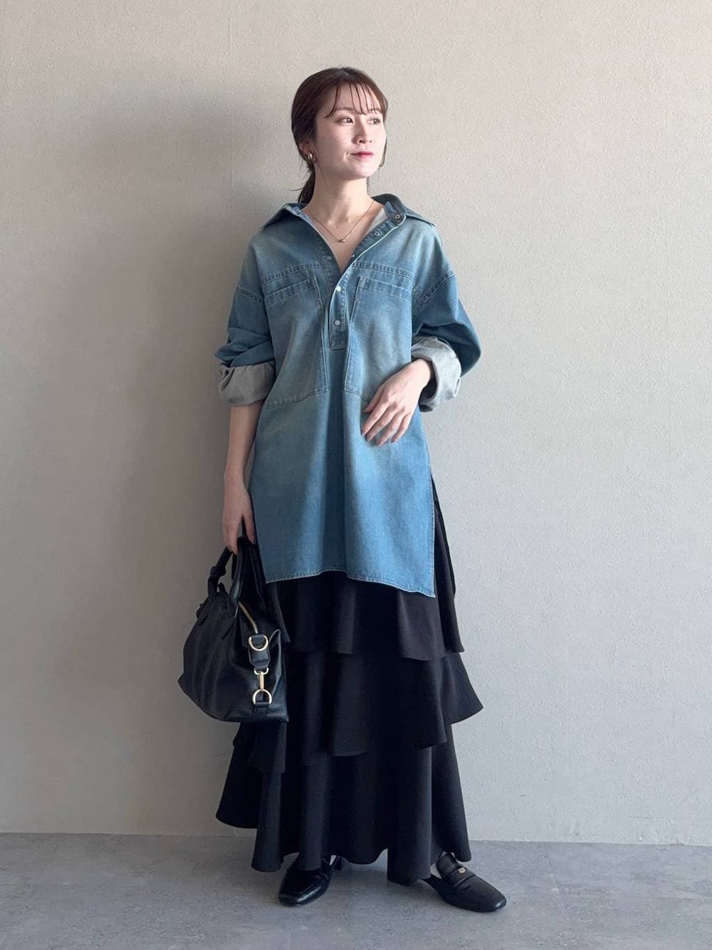 【シャツ】 春らしいデニムシャツ♪ミドル丈でヒップがすっぽり隠れます! 胸元はボタンをいくつかあけて、レースインナーやシアーインナーをレイヤードした着こなしがおすすめです。 【スカート】 シワになりにくい素材がありがたいティアードスカート…! 腰まわりさフリルが控えめなので大きく広がる心配もなし◎ 155cm|骨格ウェーブ