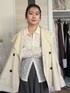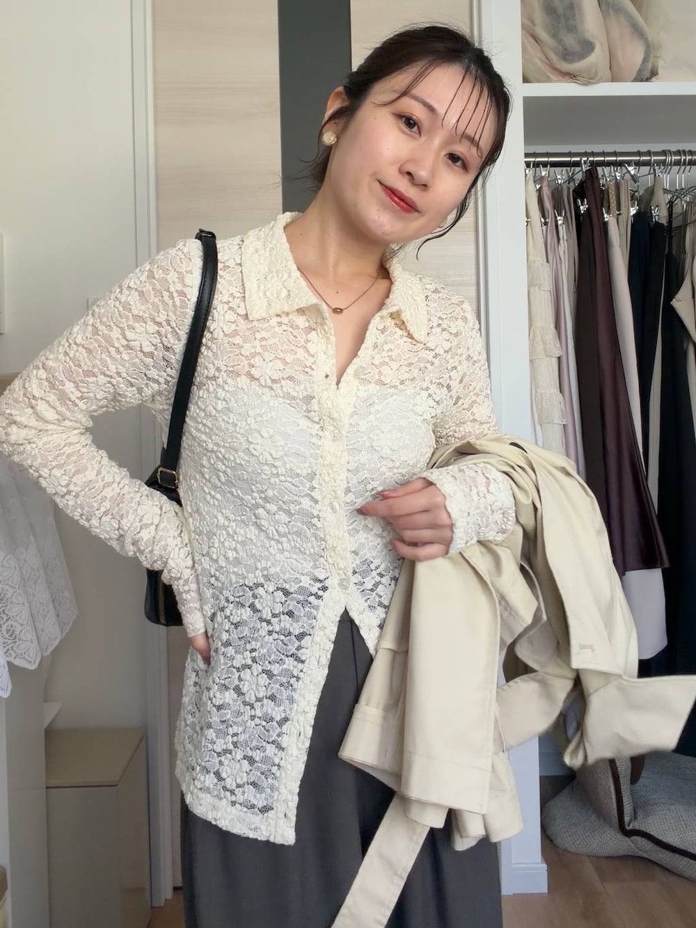 【トップス】 花柄のレースがフェミニンな印象で着られるトップス☺︎ フィット感はありますが二の腕は目立たずに着られました😭✨ ボタンは下2つほど外して着る着方がすっきり見えておすすめです。 155cm|骨格ウェーブ