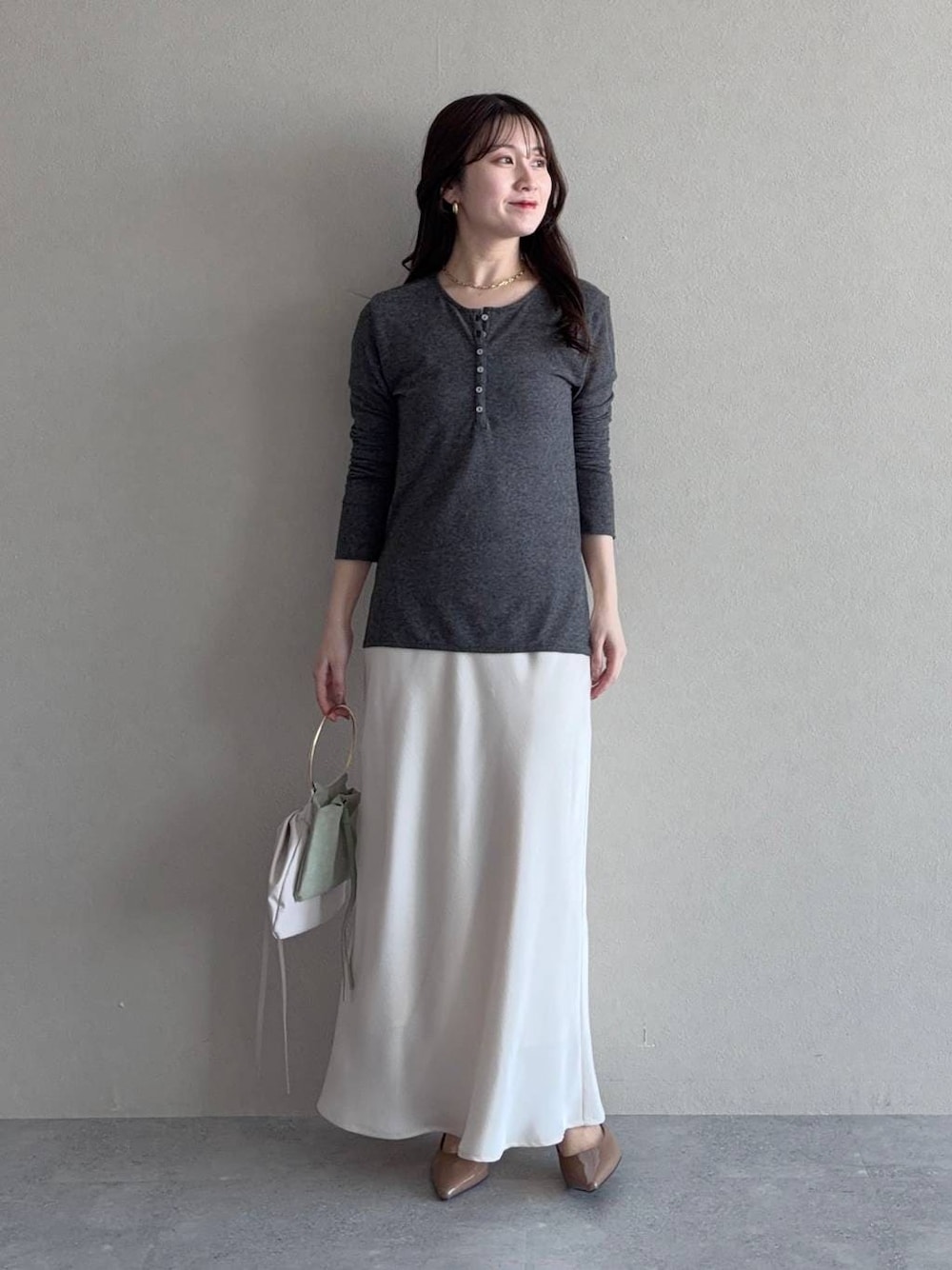 【トップス】 生地が柔らかすぎるヘンリーネックT! 1枚でも可愛く着られて、今年なら同じTシャツをレイヤードしたりシアーTを合わせたりとアレンジもできます♩ 【スカート】 シンプルでコーディネートに馴染みやすいサテンスカート シルエットはナローなのですっきり! 155cm|骨格ウェーブ