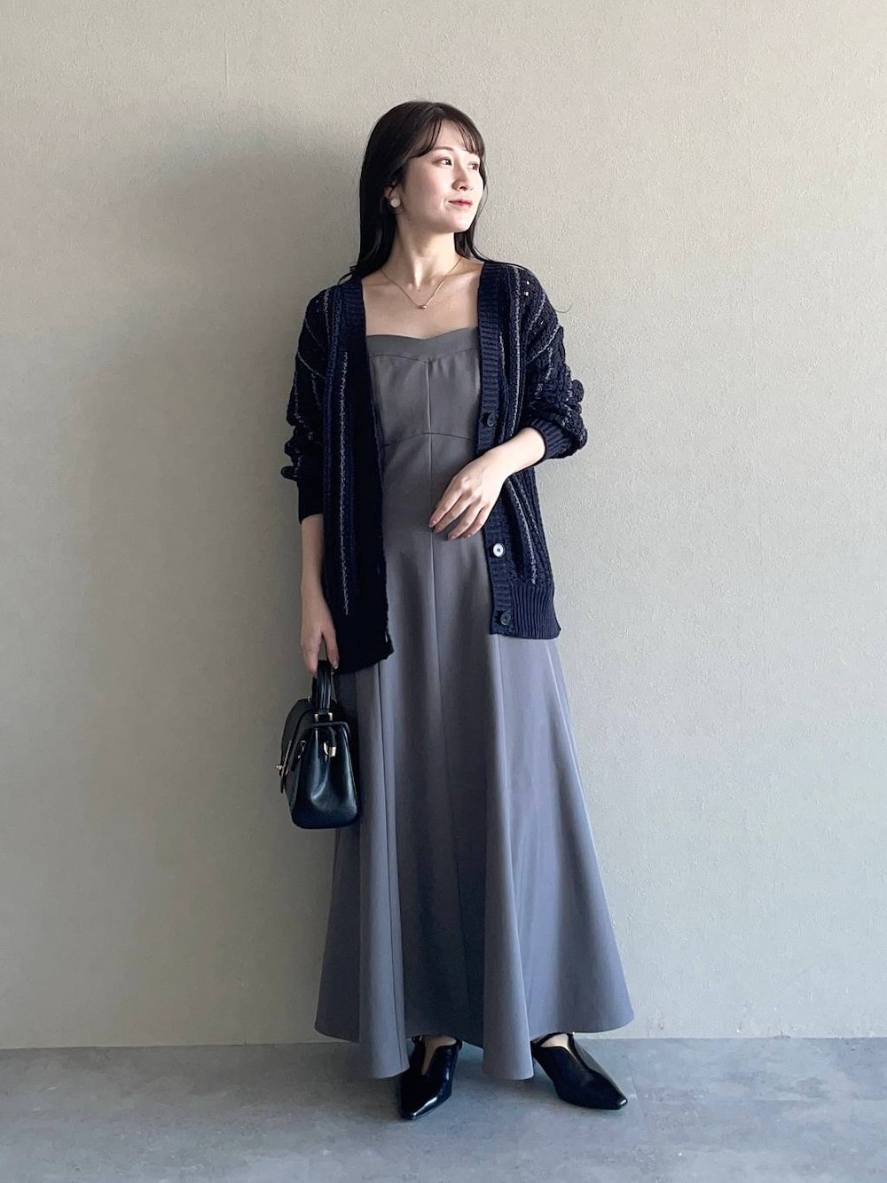 【カーディガン】 ゆるっとミドル丈のカーディガン。 シンプルだけど、4種類の糸をミックスしていてストライプのようなデザインに見えるのも1枚でお洒落に見える◎ 【ワンピース】 カーディガンとキャミワンピースのセットアイテム☺︎ キャミワンピの着回しです。 高めなウエスト切り替え位置からふわっと広がり、骨格ウェーブの私にぴったりの形でした◎ インナー次第でロングシーズン着用できるよ! 155cm|骨格ウェーブ