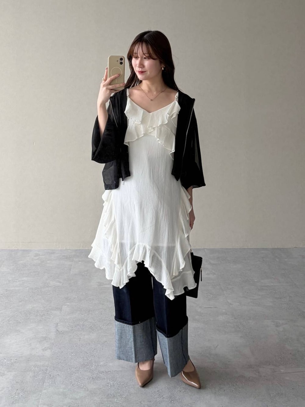 【パーカー】 カジュアルになりがちなパーカーも、楊柳素材でフェミニンコーデにも合わせやすい◎ たたむとコンパクトなので持ち運びしやすいです。 【キャミ】 フリルがポイントのキャミチュニック! 裾、胸元にはもちろん、サイドにもフリルが施されたデザインキャミ☺︎ 着るだけでコーデのポイントに♪ 【デニム】 脚長効果抜群のロールアップデニム! Sサイズ着用。ウエストぴったりでした ロールアップ部分は自分の好きなところで折り返しを変えられます☺︎ 155cm|骨格ウェーブ