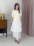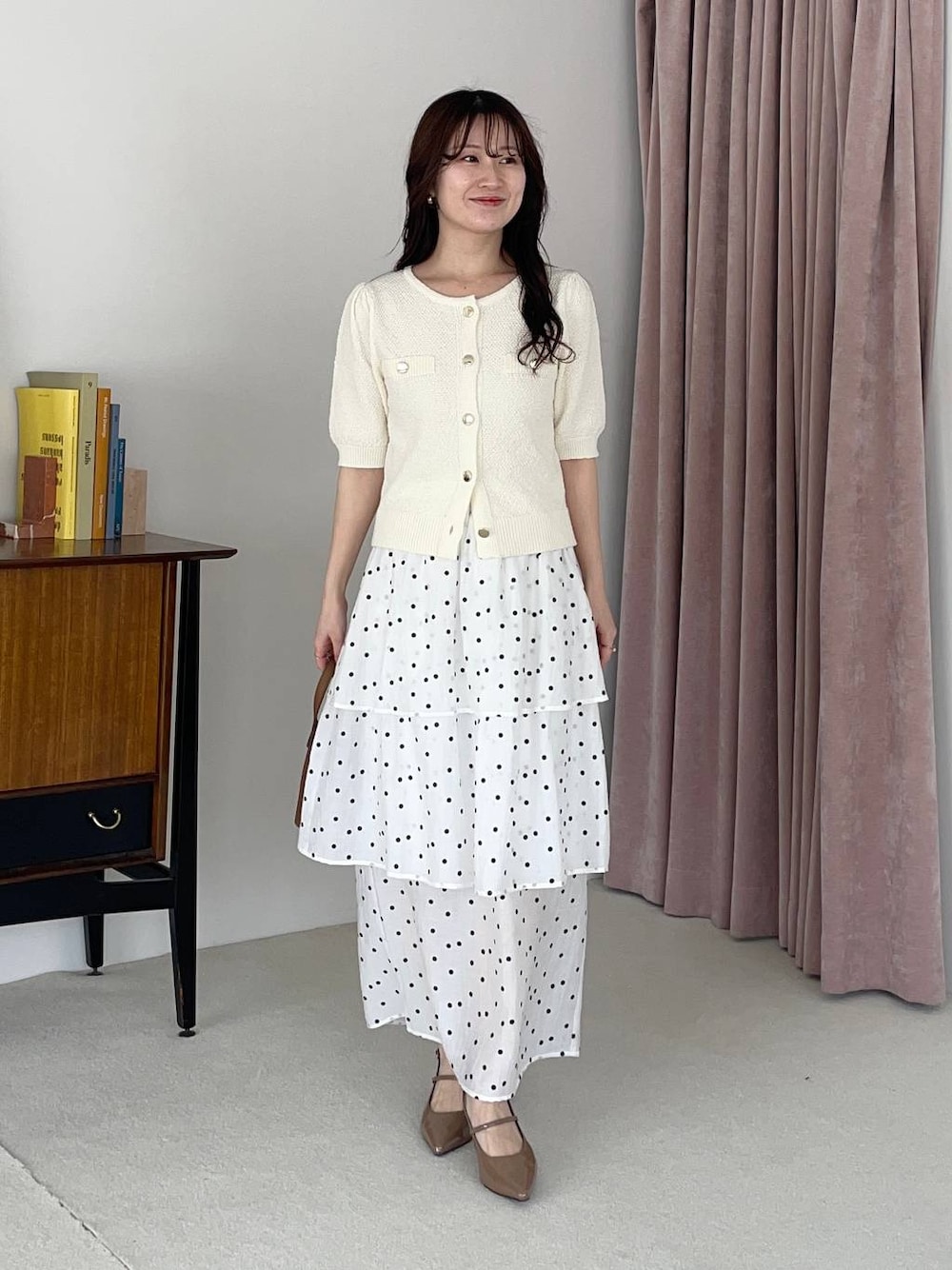 【カーディガン】 ON/OFFで着られるサマーカーディガン♡チクチク感はゼロです。 ほんのりボリューム袖が二の腕をカバーしてくれます♪ コーディネートがしやすいコンパクトな着丈◎ 【スカート】 ミスティらしいティアードデザインのドット柄スカート♩ ナローシルエットなのですっきり!◎ 少し透け感のある生地で涼しげに穿けます。 155cm|骨格ウェーブ