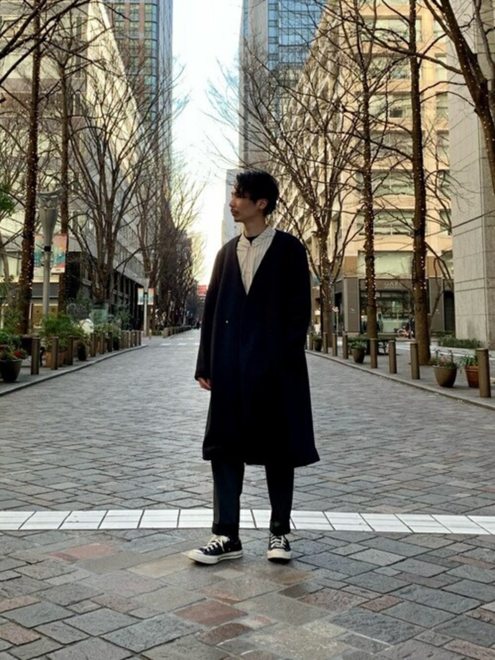 mmk7lyのノーカラーコート「ダブルフェイスVネックコート」を使ったコーディネート