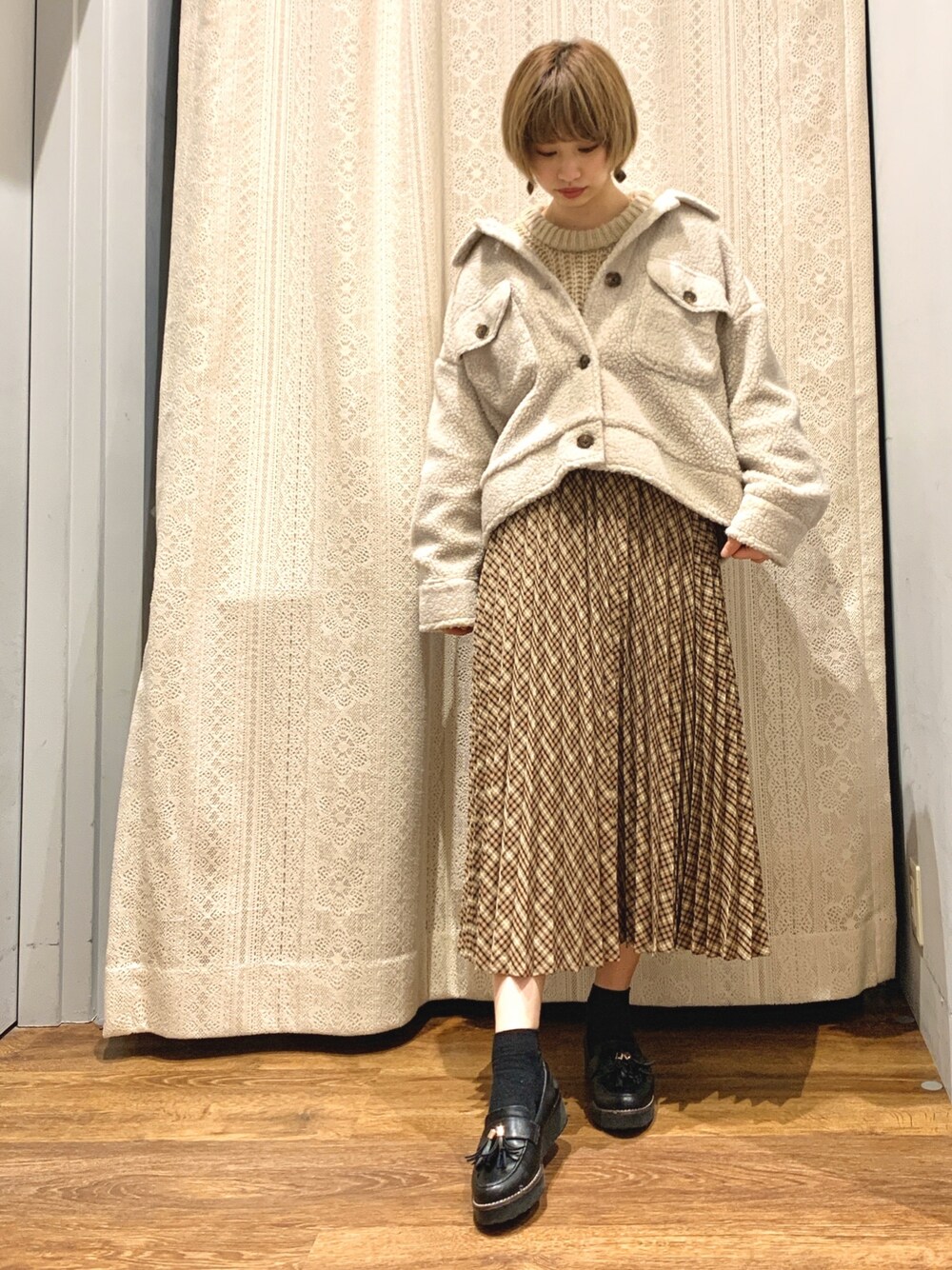 ボアCPOとチェックプリーツスカート。 ベージュでまとめました。 少し抜襟で着て、ゆったりめの雰囲気で。 プリーツスカートは、カラーバリエーションもあり、色違いでも欲しくなるアイテムです♪