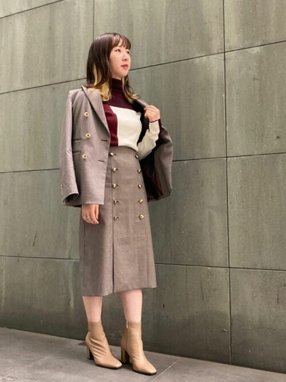同素材のジャケットとスカートでまとめてみました。 スカートは、インナーをウエストインした際にすっきりと着こなして頂ける、ハイウエストのデザインなのでスタイルアップ効果も期待できます。