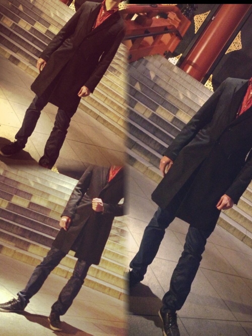 旦那ちゃんOUT FIT #ロングテーラードJK/??? #赤シャツ/zara #パンツ/zara #シューズ/??? 夜桜見に墨田公園!♪ 雨ぱらついて寒かったのでロングテーラード着てました!