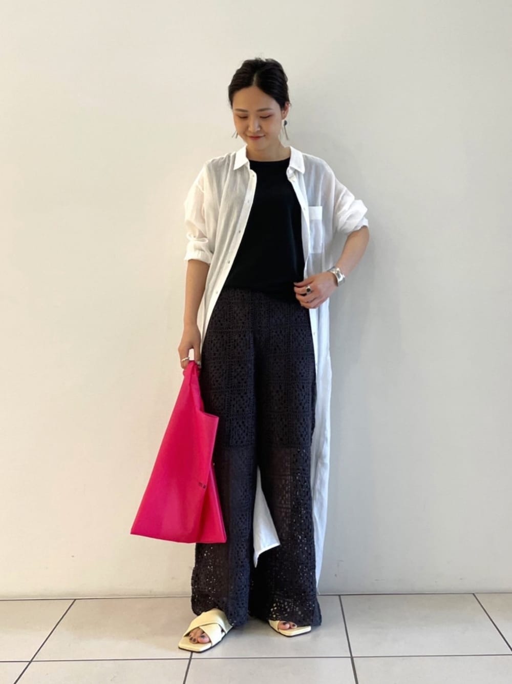 羽織りにもワンピースにもなる 着回し力の高いシアーシャツ🍃 すっきりめのロングシャツなので メンズライクなスタイリングに◎ mactのエコバッグ、いい仕事してます👏